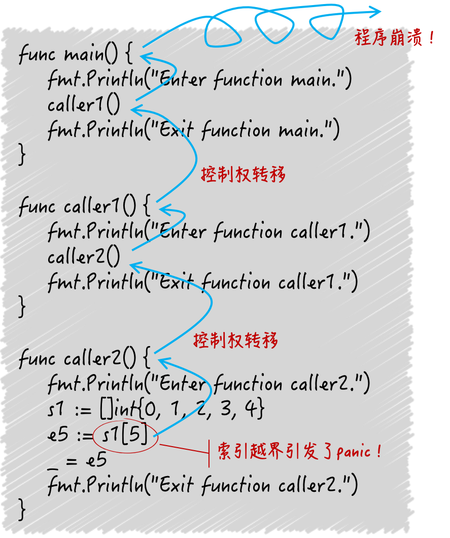 我们先说一个大致的过程:某个函数中的某行代码有意或无意地引发了一个panic。这时,初始的panic详情会被建立起来,并且该程序的控制权会立即从此行代码转移至调用其所属函数的那行代码上,也就是调用栈中的上一级。