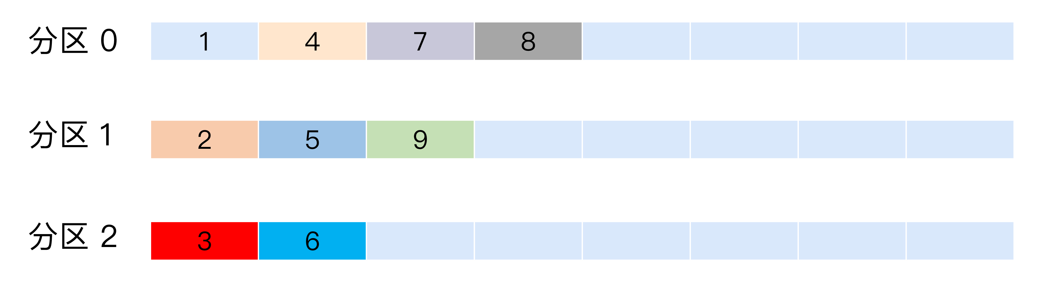 也称Round-robin策略,即顺序分配。比如一个主题下有3个分区,那么第一条消息被发送到分区0,第二条被发送到分区1,第三条被发送到分区2,以此类推。当生产第4条消息时又会重新开始,即将其分配到分区0,就像下面这张图展示的那样。