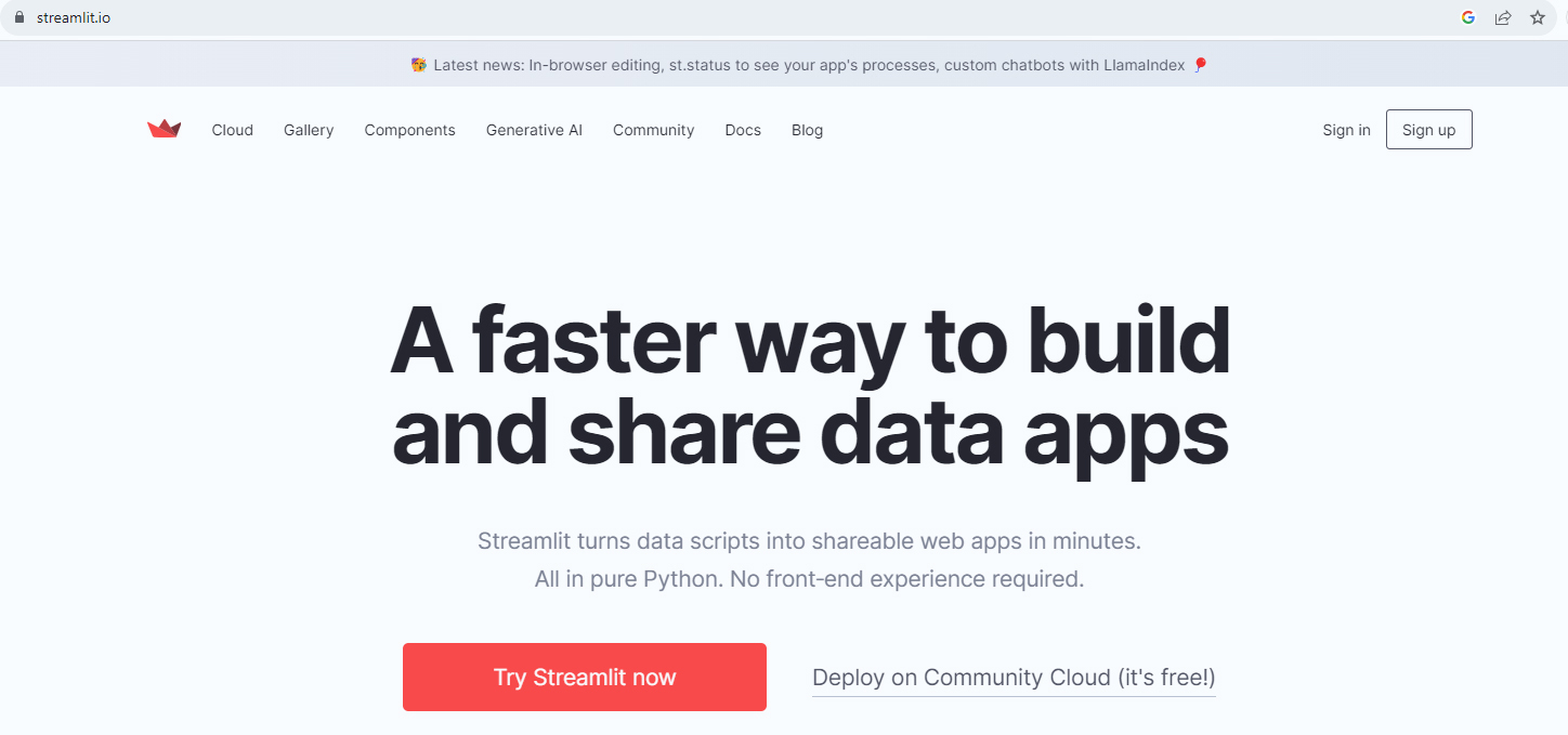 方案 1 :通过 Streamlit 部署聊天机器人 首先来看看Streamlit。这是一个挺有名的专门为数据科学家和机器学习工程师设计的开源Python库,它可以迅速地将Python脚本转化为交互式Web应用。