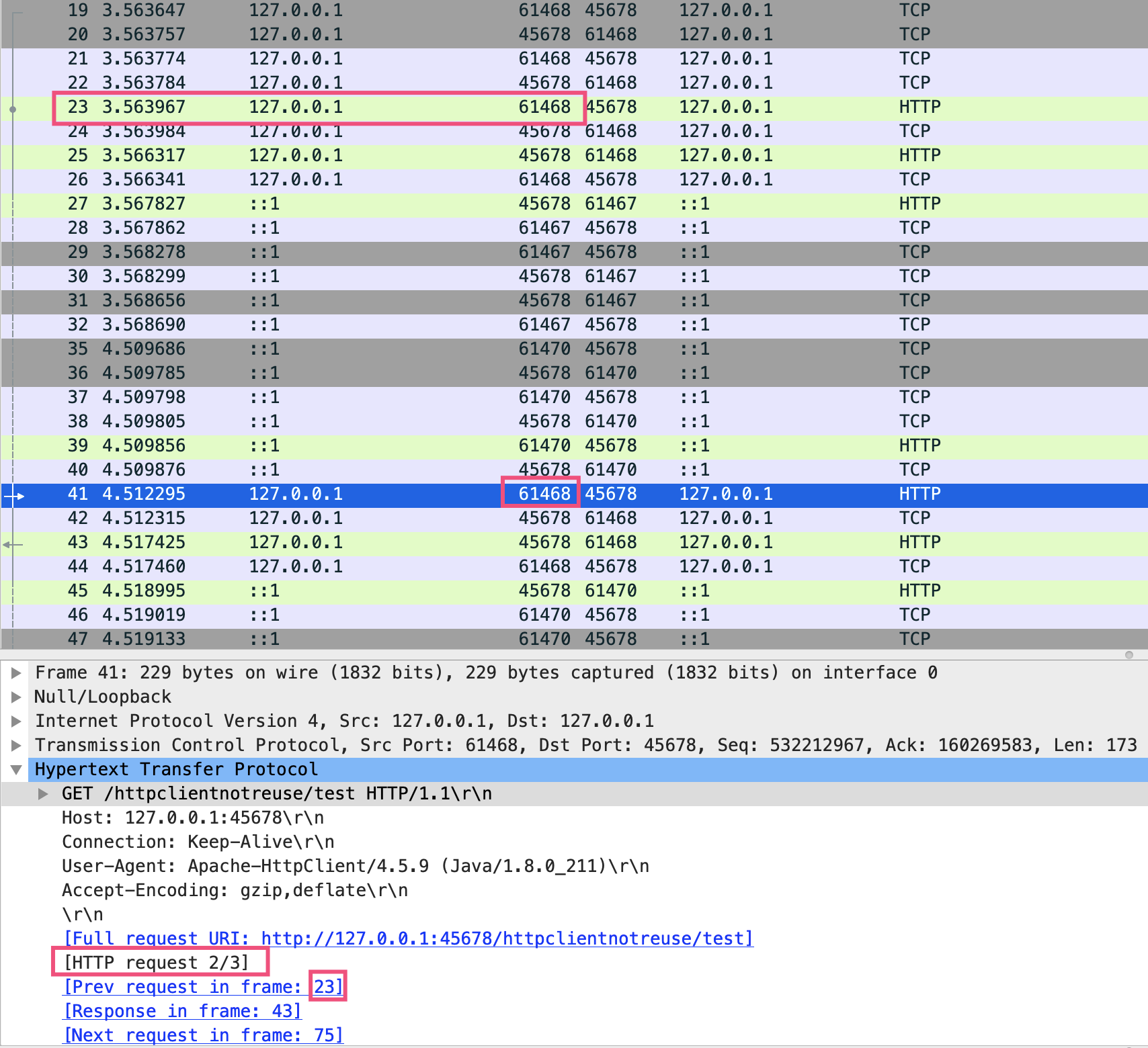 而复用连接池方式的接口right的表现就完全不同了。可以看到,第二次HTTP请求#41的客户端端口61468和第一次连接#23的端口是一样的,Wireshark也提示了整个TCP会话中,当前#41请求是第二次请求,前一次是#23,后面一次是#75: