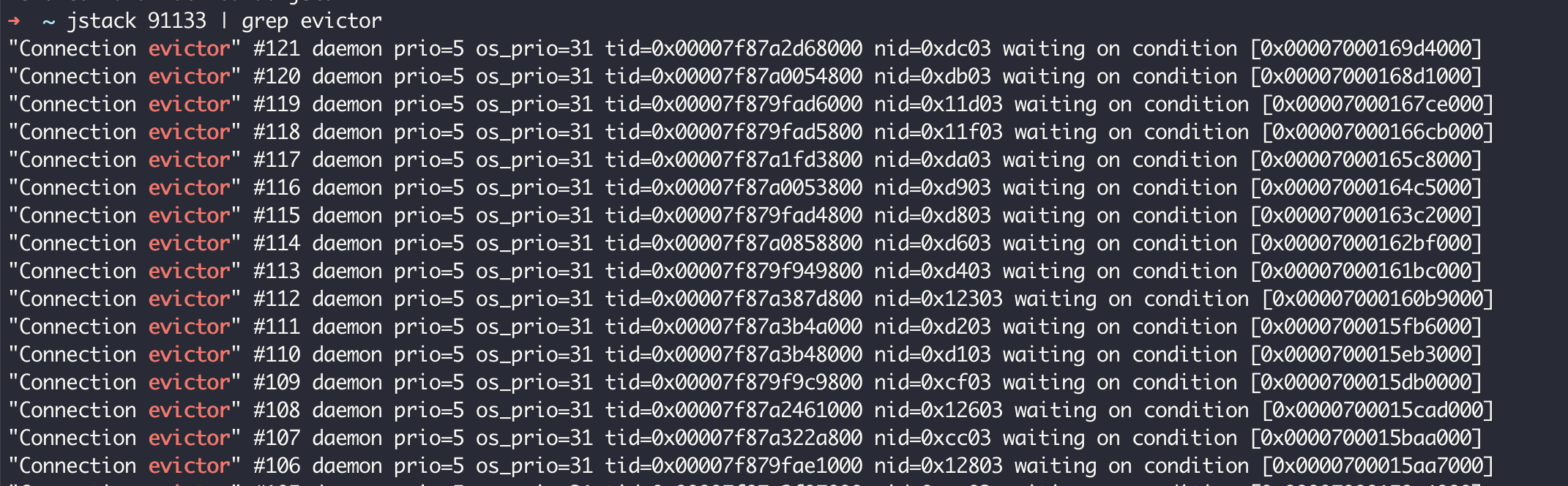 访问这个接口几次后查看应用线程情况,可以看到有大量叫作Connection evictor的线程,且这些线程不会销毁: