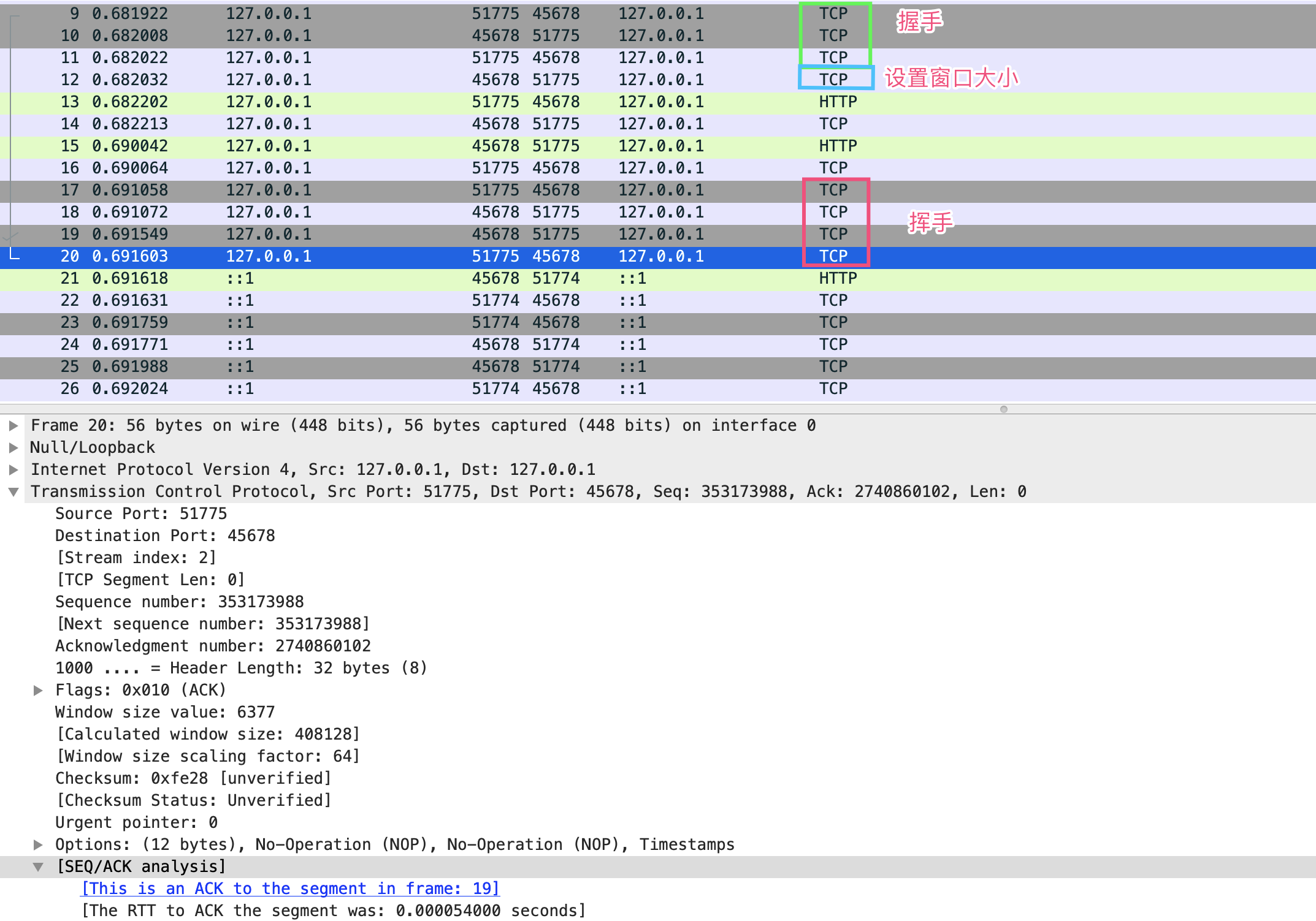 也就是说,每次都是新的TCP连接,放开HTTP这个过滤条件也可以看到完整的TCP握手、挥手的过程: