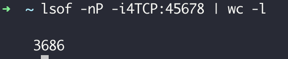 对这个接口进行几秒的压测(压测使用wrk,1个并发1个连接)可以看到,已经建立了三千多个TCP连接到45678端口(其中有1个是压测客户端到Tomcat的连接,大部分都是HttpClient到Tomcat的连接):