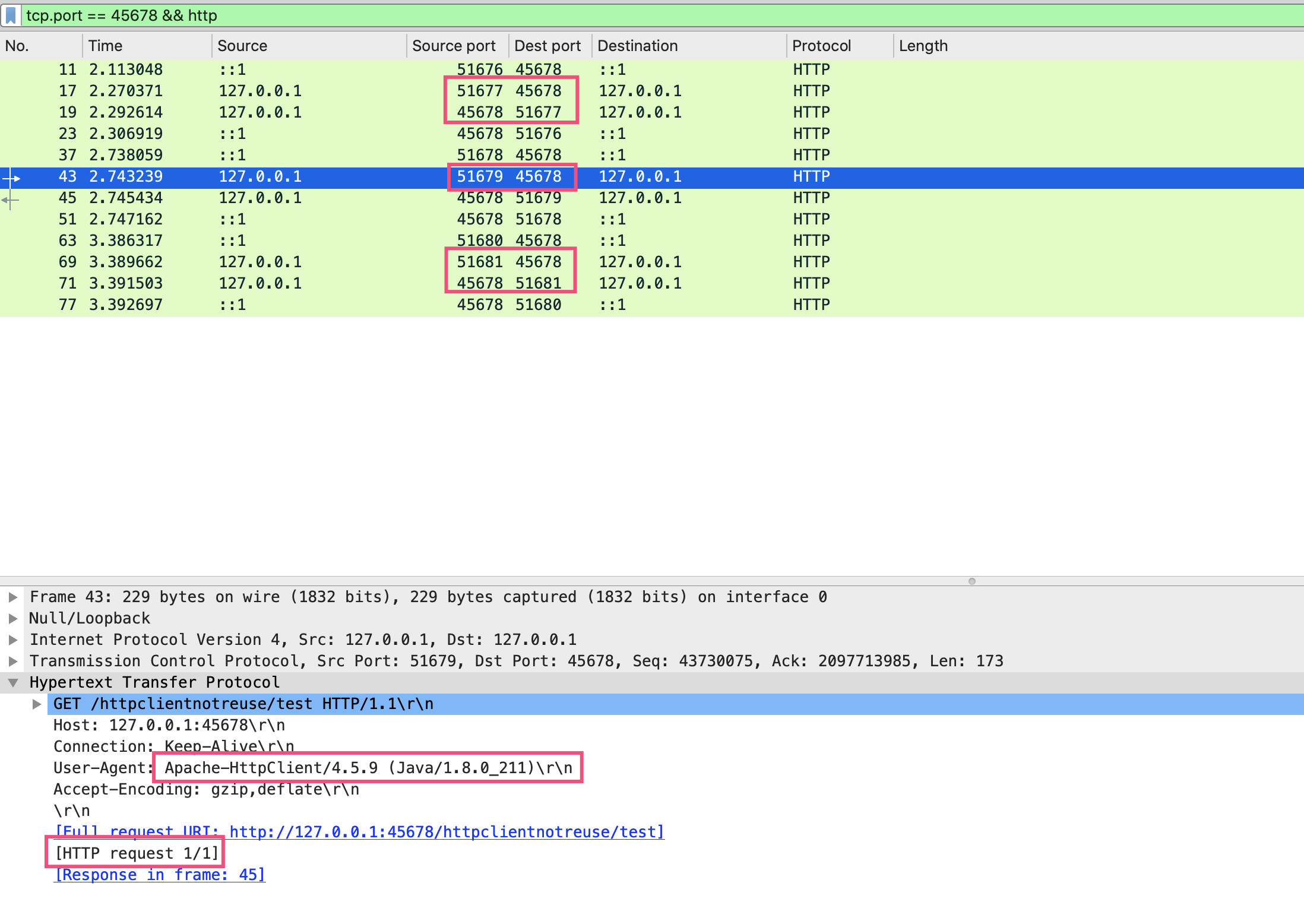 如果调用wrong2接口每次创建新的连接池来发起HTTP请求,从Wireshark可以看到,每次请求服务端45678的客户端端口都是新的。这里我发起了三次请求,程序通过HttpClient访问服务端45678的客户端端口号,分别是51677、51679和51681: