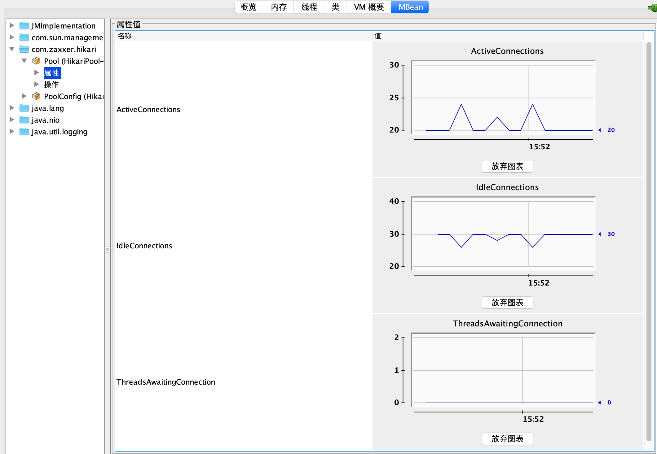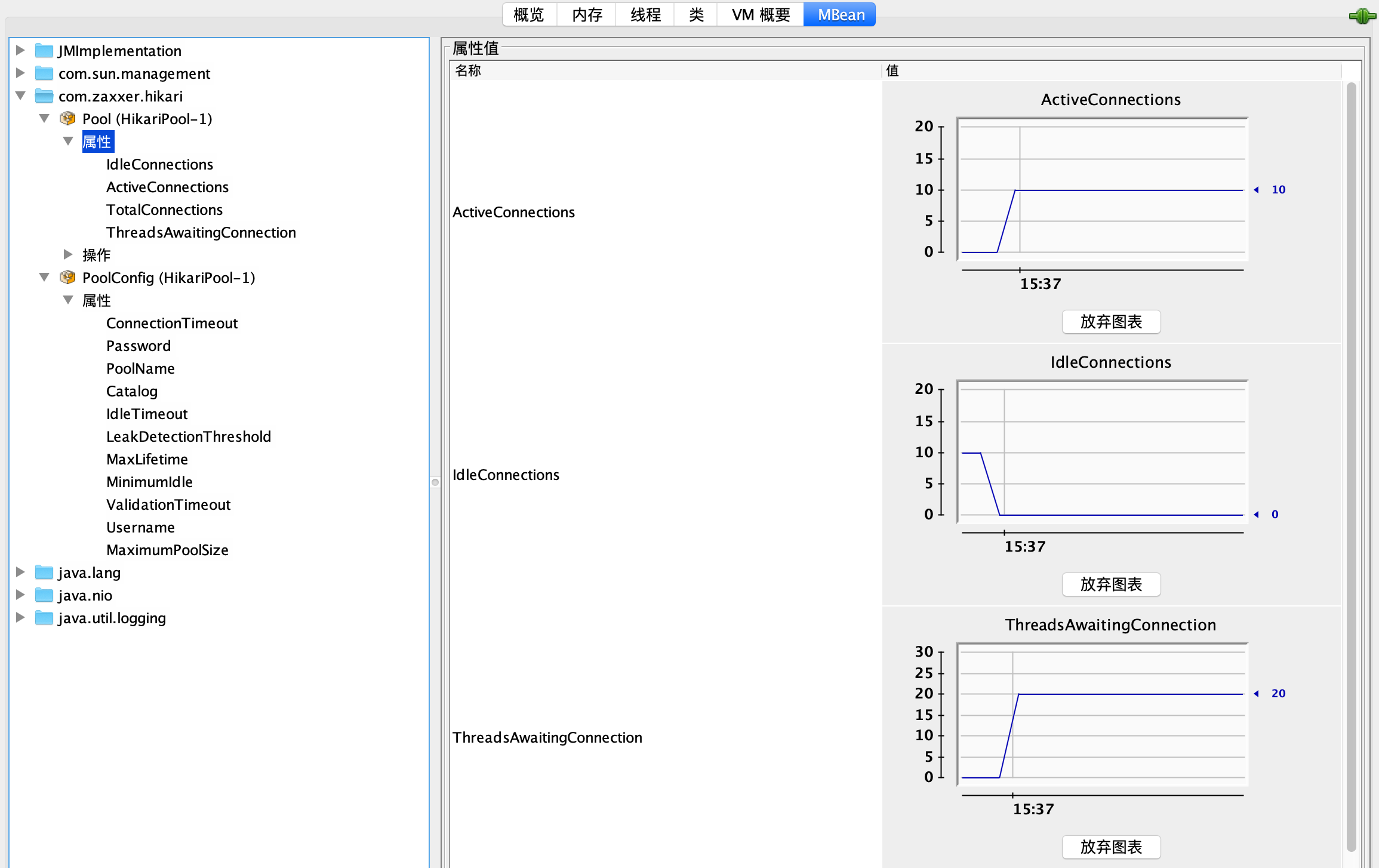 随后,修改配置文件启用register-mbeans,使Hikari连接池能通过JMX MBean注册连接池相关统计信息,方便观察连接池: