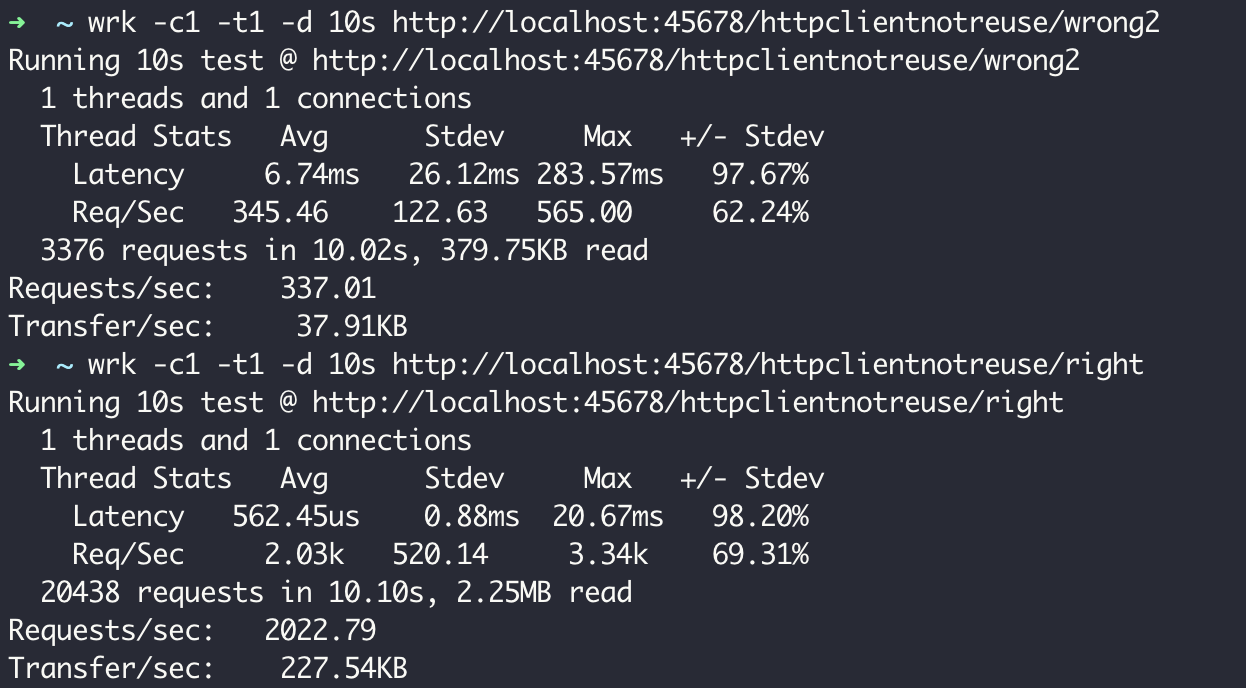 使用wrk对wrong2和right两个接口分别压测60秒,可以看到两种使用方式性能上的差异,每次创建连接池的QPS是337,而复用连接池的QPS是2022: