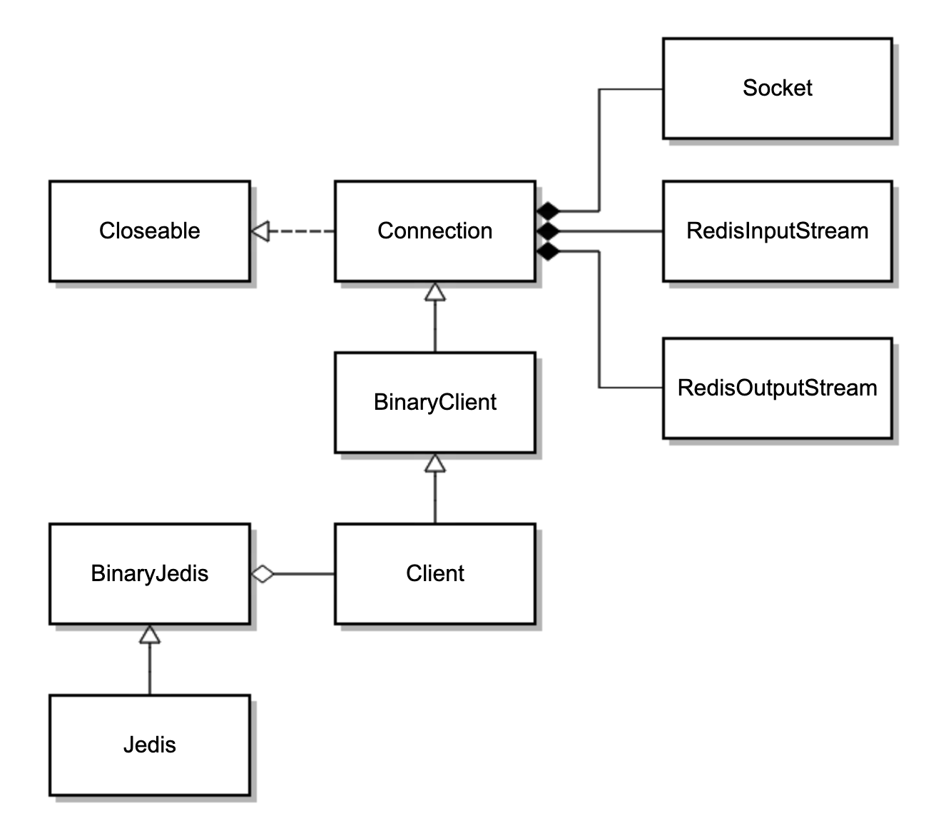 可以看到,Jedis继承了BinaryJedis,BinaryJedis中保存了单个Client的实例,Client最终继承了Connection,Connection中保存了单个Socket的实例,和Socket对应的两个读写流。因此,一个Jedis对应一个Socket连接。类图如下: