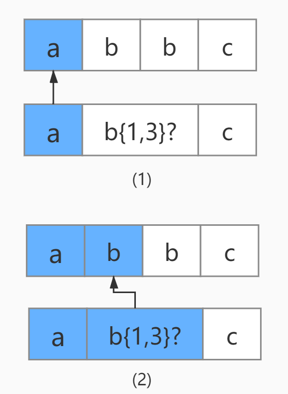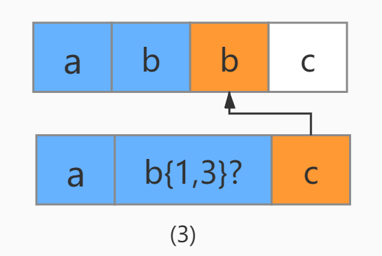 其次,由于懒惰模式下,正则表达式会尽可能少地重复匹配字符,匹配字符串中的下一个匹配字符b不会继续与b{1,3}进行匹配,从而选择放弃最大匹配b字符,转而匹配正则表达式中的下一个字符c。