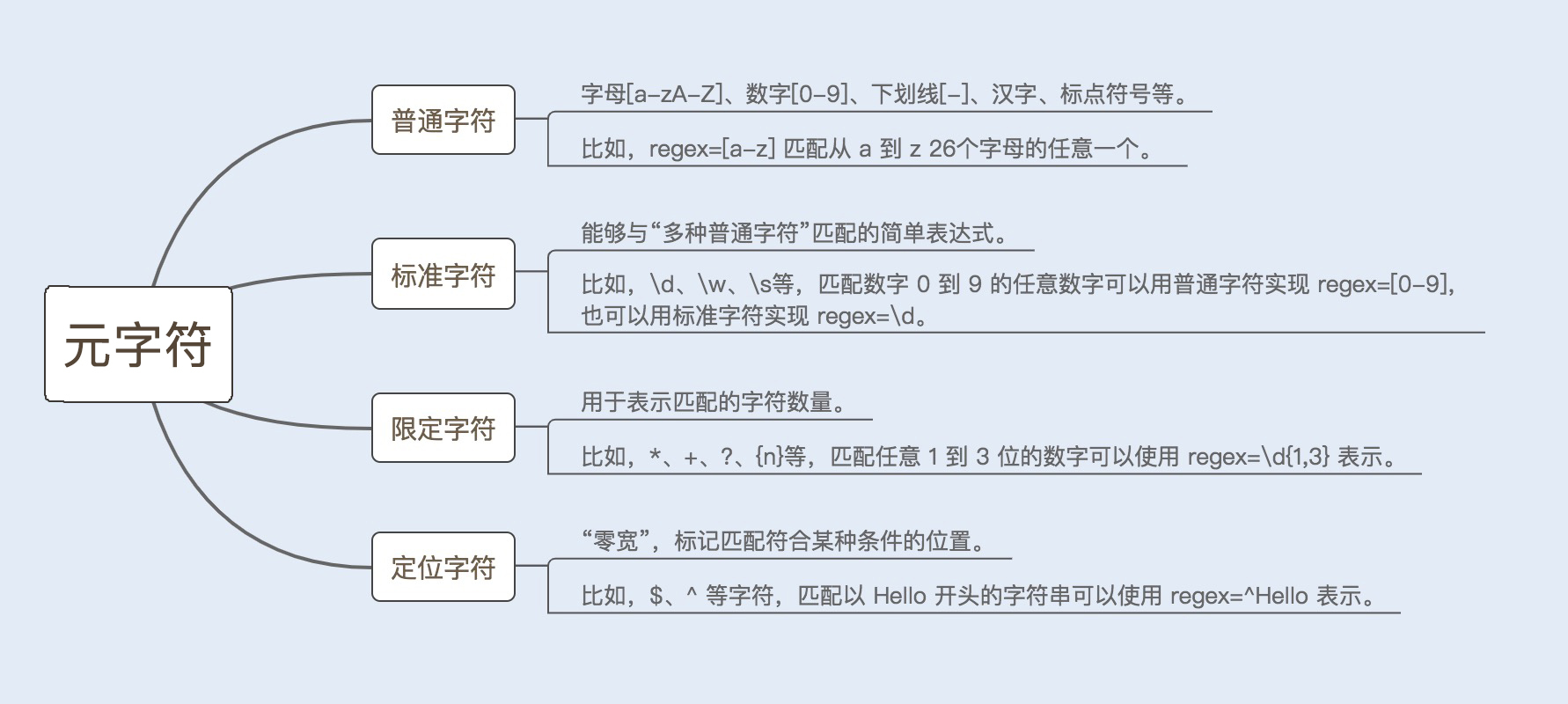 构造正则表达式语法的元字符,由普通字符、标准字符、限定字符(量词)、定位字符(边界字符)组成。详情可见下图: