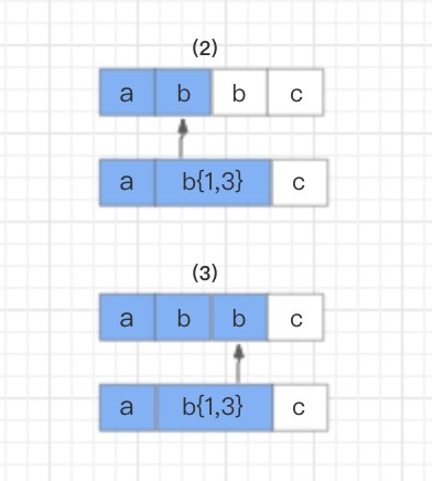 首先,读取正则表达式第一个匹配符a和字符串第一个字符a进行比较,a对a,匹配。然后,读取正则表达式第二个匹配符 b{1,3} 和字符串的第二个字符b进行比较,匹配。