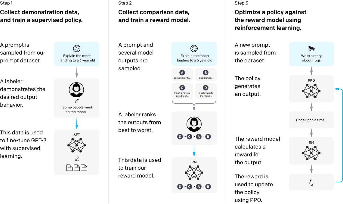那RLHF到底该怎么做呢?简单理解,就是通过一个奖励模型(RM)引导基线模型(如GPT-3)做出反应,而这个奖励模型就是按照人类偏好训练好的模型。我们来看一下OpenAI给出的RLHF过程示意图,大体上分为3步。