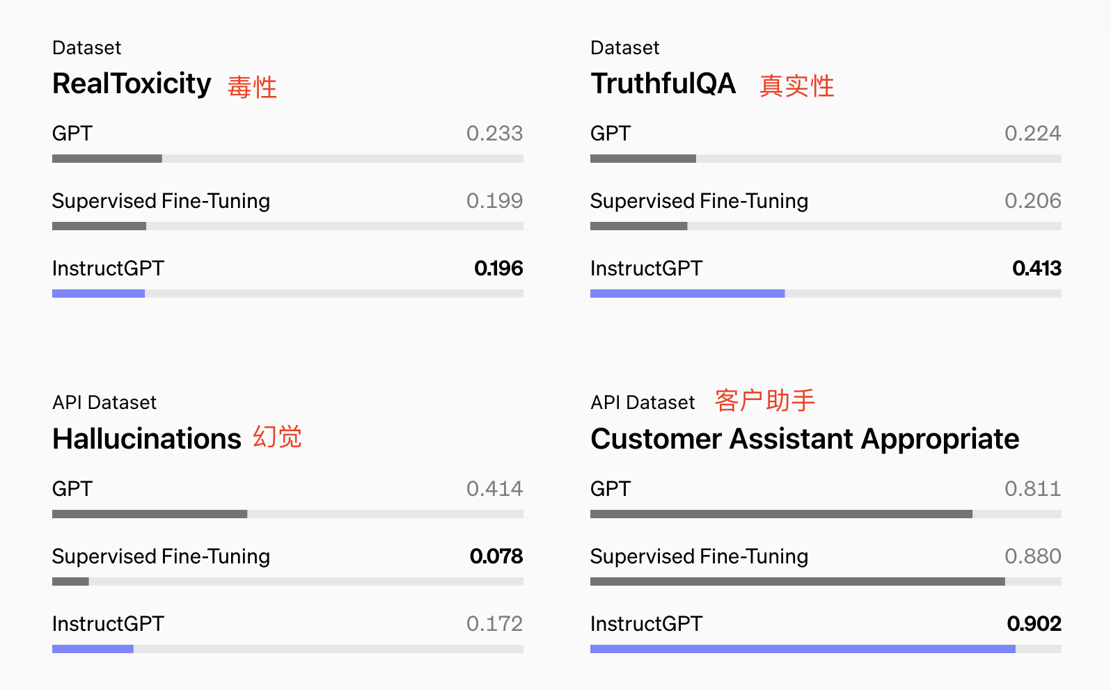 后来为了解决这个问题,OpenAI基于RLHF做了指令微调模型 InstructGPT,使大模型输出的有害内容大大减少,虽然参数少了100倍以上,但与175B参数的GPT-3输出相比,仅有1.3B规模参数InstructGPT模型的输出更加符合人类意图。我们看一下官网披露的GPT-3经过SFT和指令微调后,在各种指标方面的对比。