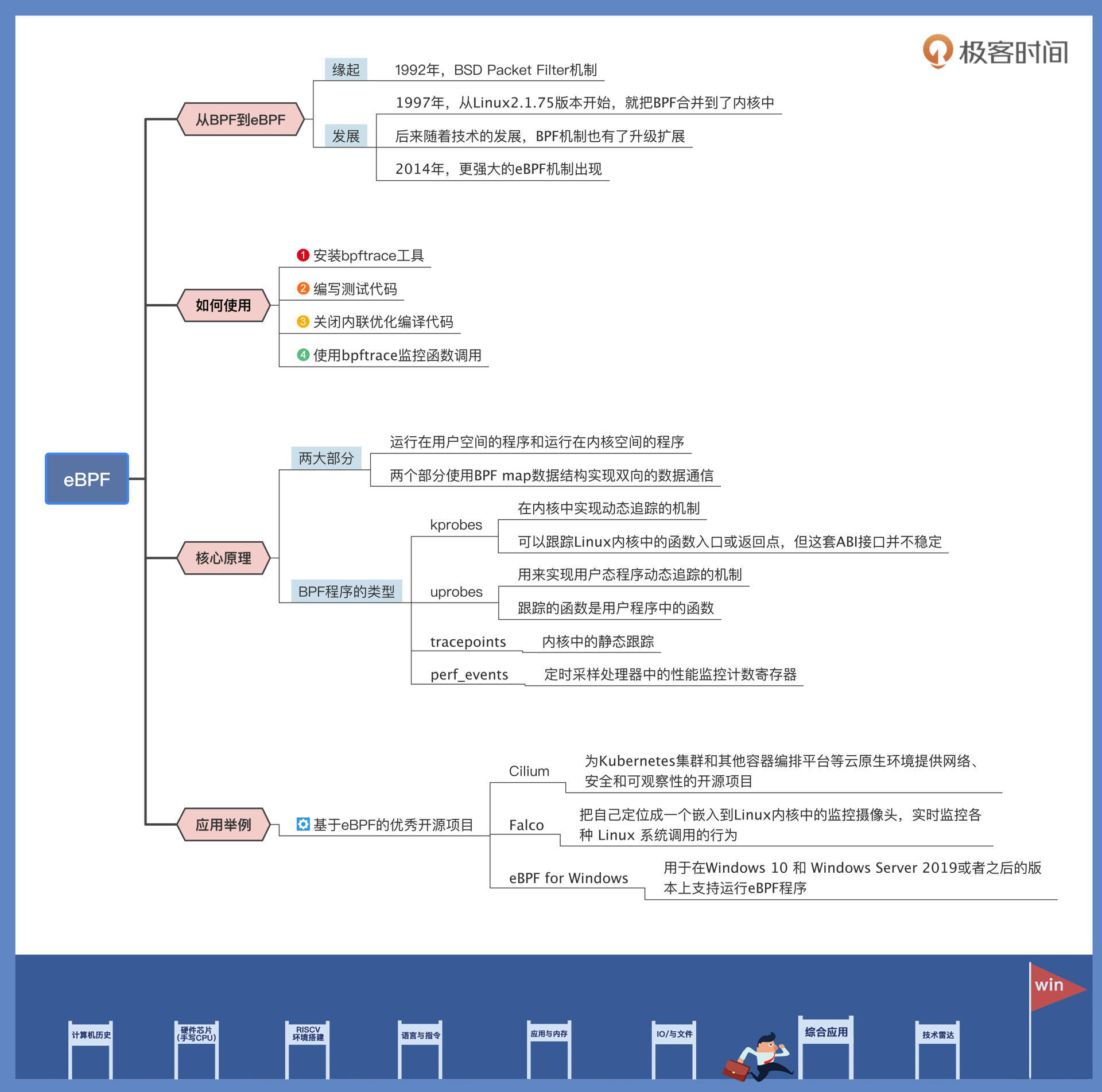 所以看到这里,你可能看出门道了,原来eBPF能用上帝视角观察各种程序,关键就在于“内核中有自己人”。