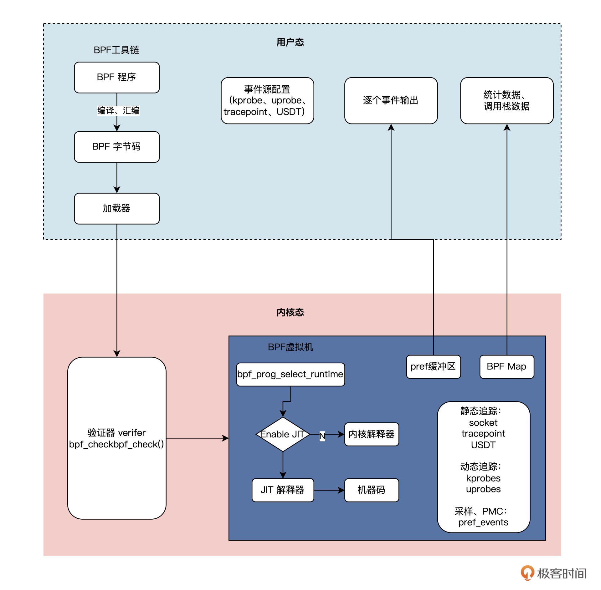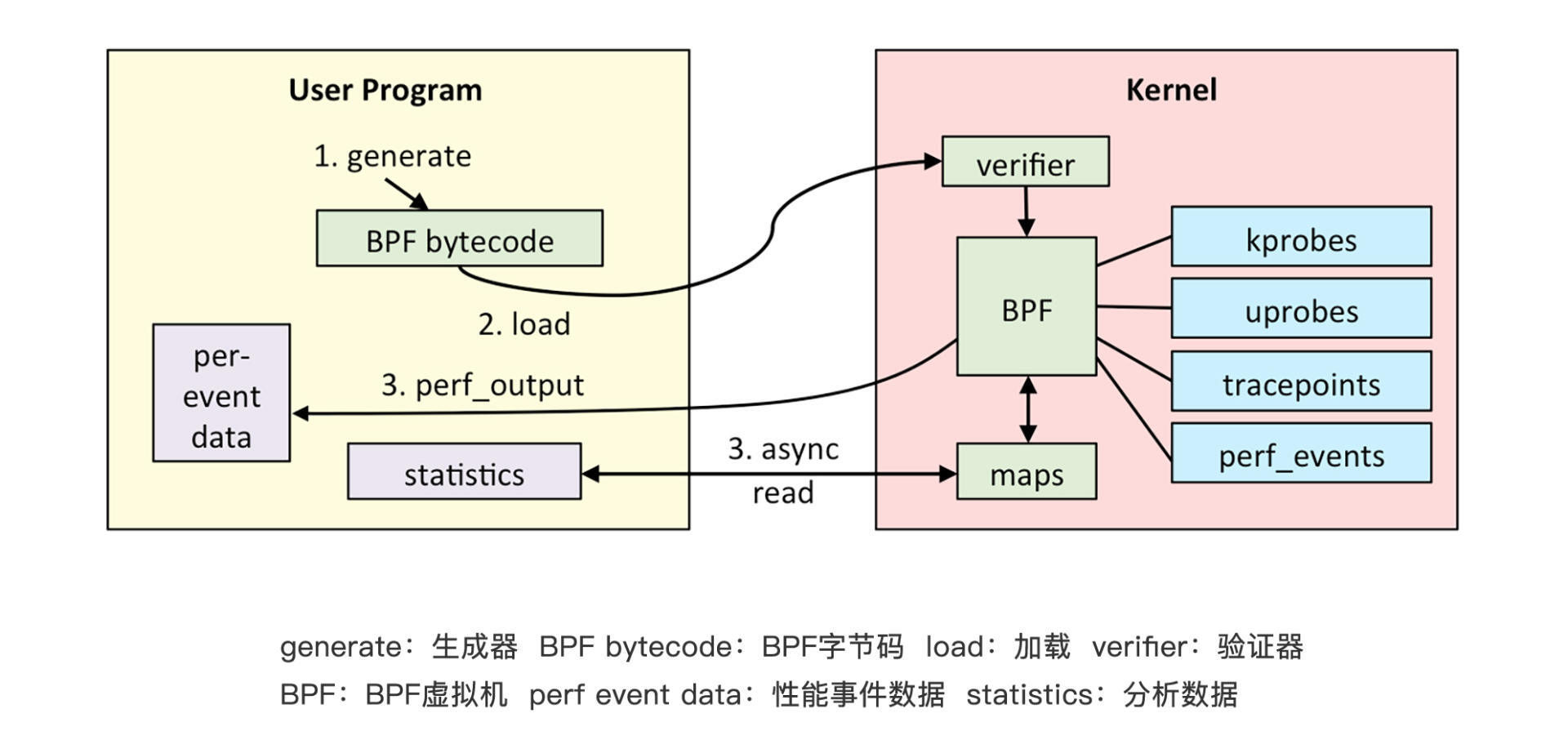 eBPF 虚拟机则是相当于一个在内核中的、安全的“后门”,而在虚拟机上运行的BPF 字节码程序可以使用BPF map数据结构和perf-event这两种机制,将测量数据“偷偷”传递到用户空间。