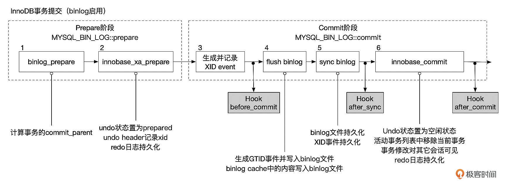 如上图所示,MySQL事务的提交分为Prepare和Commit两个阶段。在Prepare阶段,依次进行Binlog Prepare和InnoDB Prepare,只有当Binlog和InnoDB都Prepare成功后,事务才能进行后续的提交步骤。