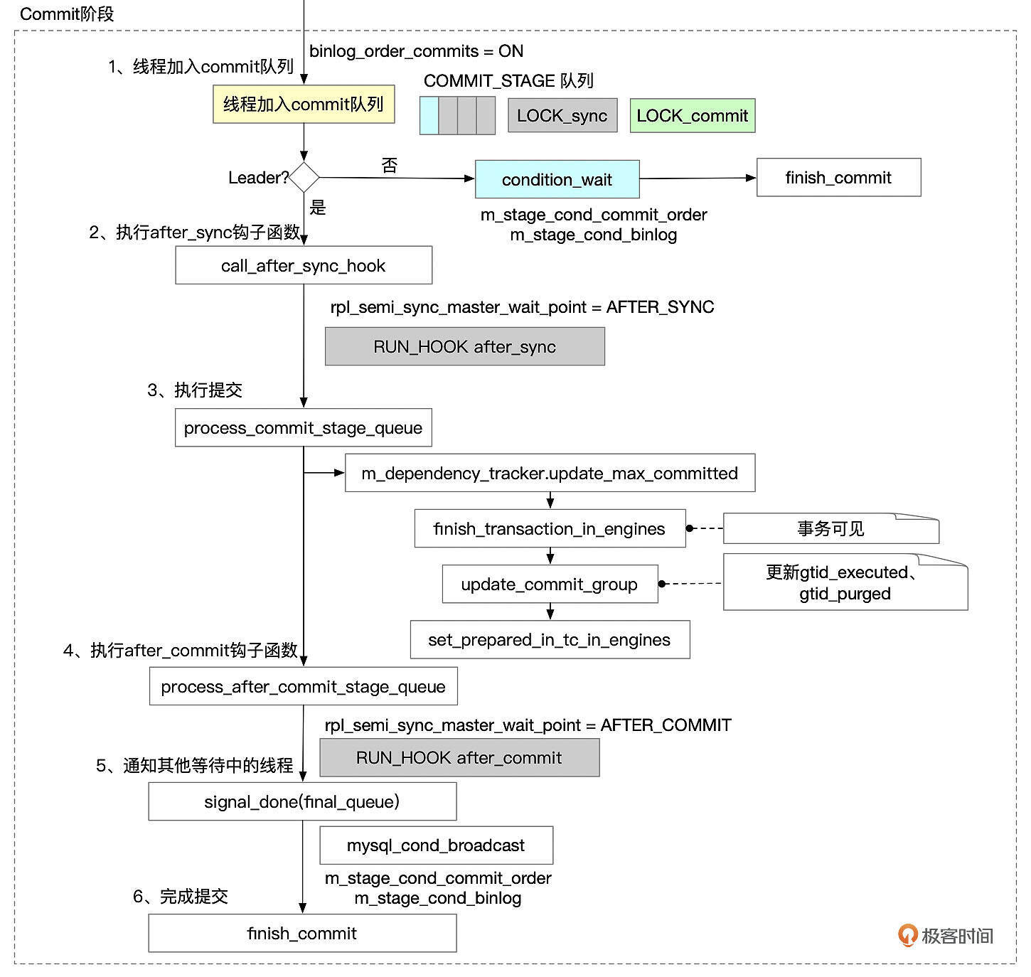 - 如果参数binlog_order_commits设置为ON,则sync阶段的leader线程加入commit队列。第一个加入队列的线程成为leader,进行后续的提交操作。其他线程作为follower,等待leader完成提交后再继续处理。如果binlog_order_commits设置为OFF,则线程不需要进入commit队列,在调用after_sync钩子函数后,然后直接进入到第5步唤醒其它等待提交的事务,由各个事务各自完成提交动作。
