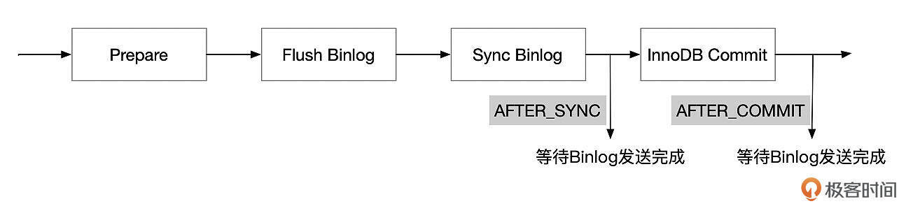 在AFTER_SYNC的设置下,事务的Binlog Sync到磁盘之后,等待Binlog发送给备库。Binlog Sync之后,事务对其他线程还不可见。如果这个时候主库异常崩溃了,业务切换到备库。由于Binlog还没有同步到备库,所以备库上也看不到事务所做的修改。从业务的角度看,主备库数据是一致的。