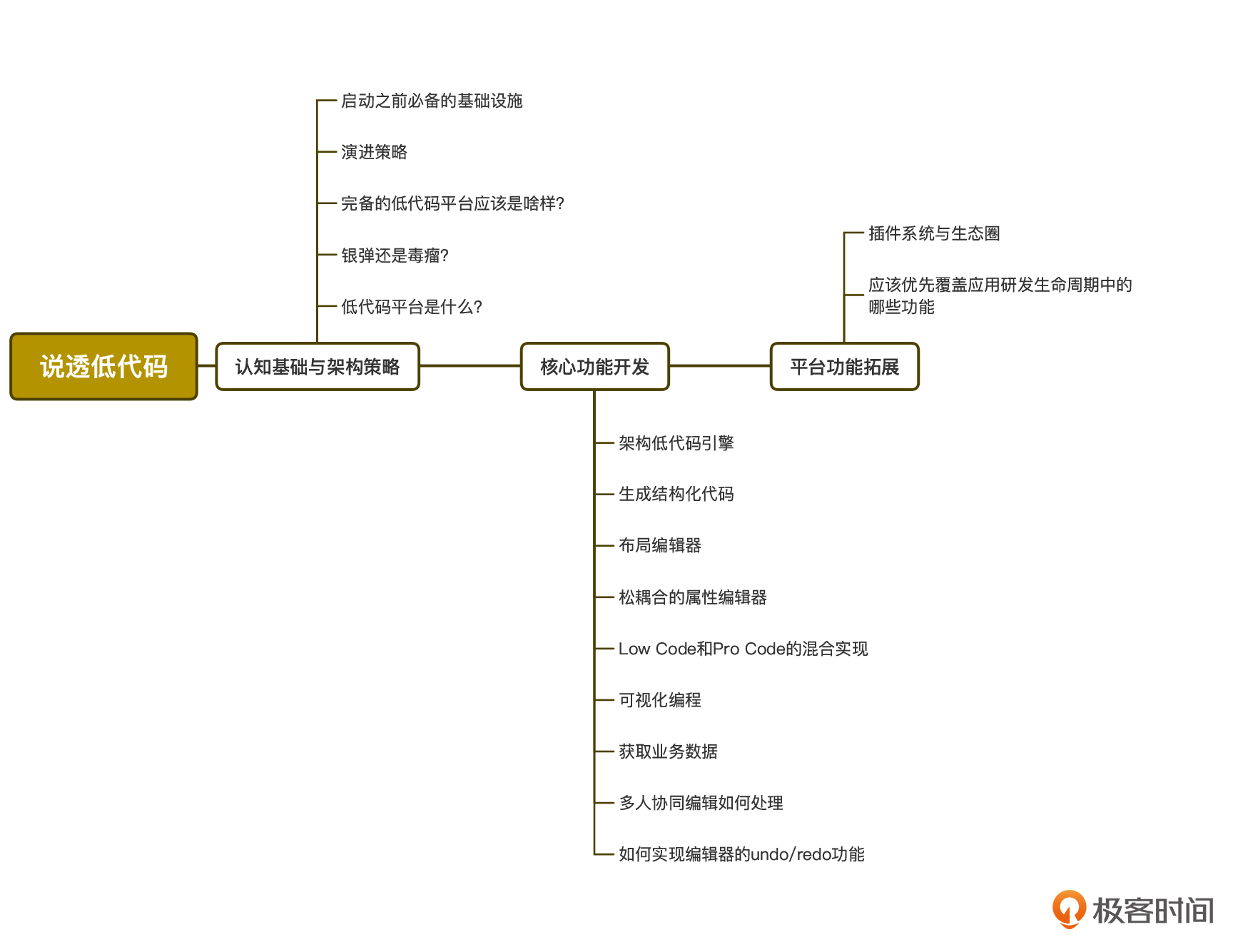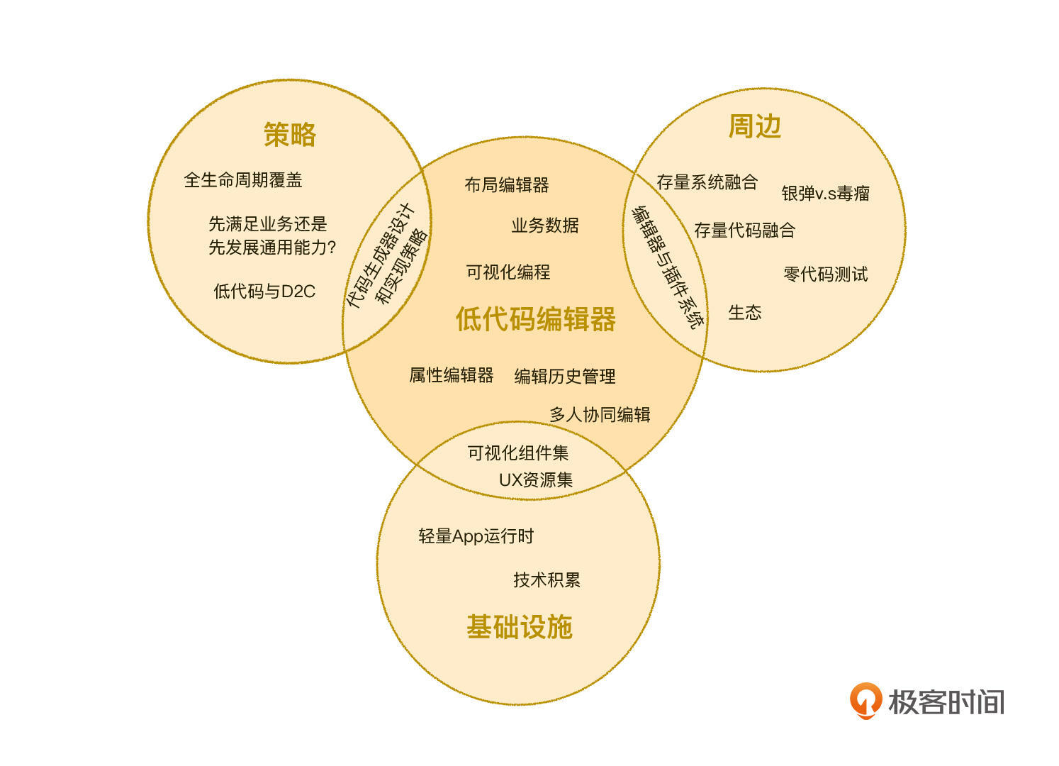 你可以发现,这三部分覆盖了以低代码编辑器为核心,同时包括代码生成器及策略、基础设施、插件系统及周边等三大编辑器的主要研发支线延伸。其中低代码编辑器的内容占据了专栏的绝大部分,三大延伸内容也都覆盖了关键内容。