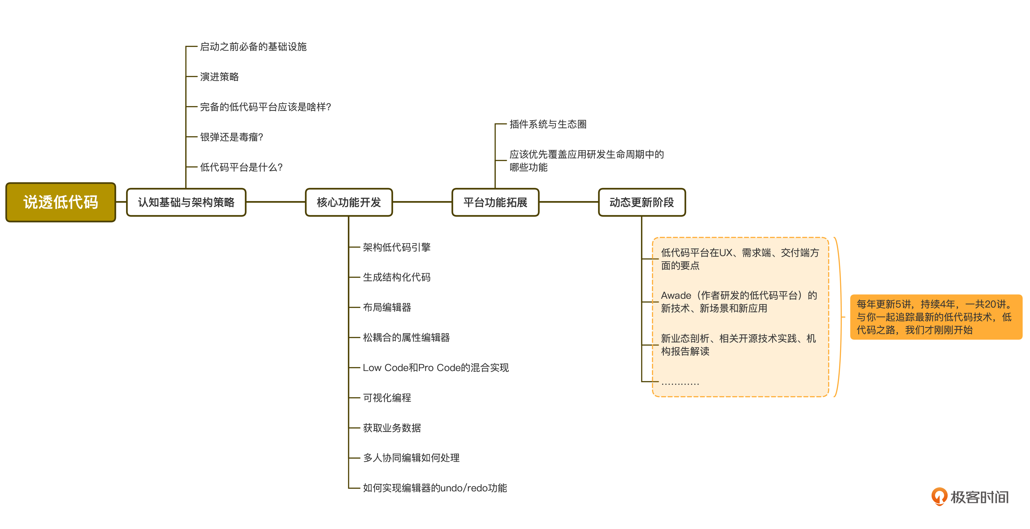到这里你可能会发现,似乎这三部分并不是这个专栏的全部。确实,这是动态更新的专栏,第一阶段更新完后的四年之内,我会以每年5讲的频率,继续更新,带你去看最新、最前沿的低代码技术动态。内容主要有这些方面: