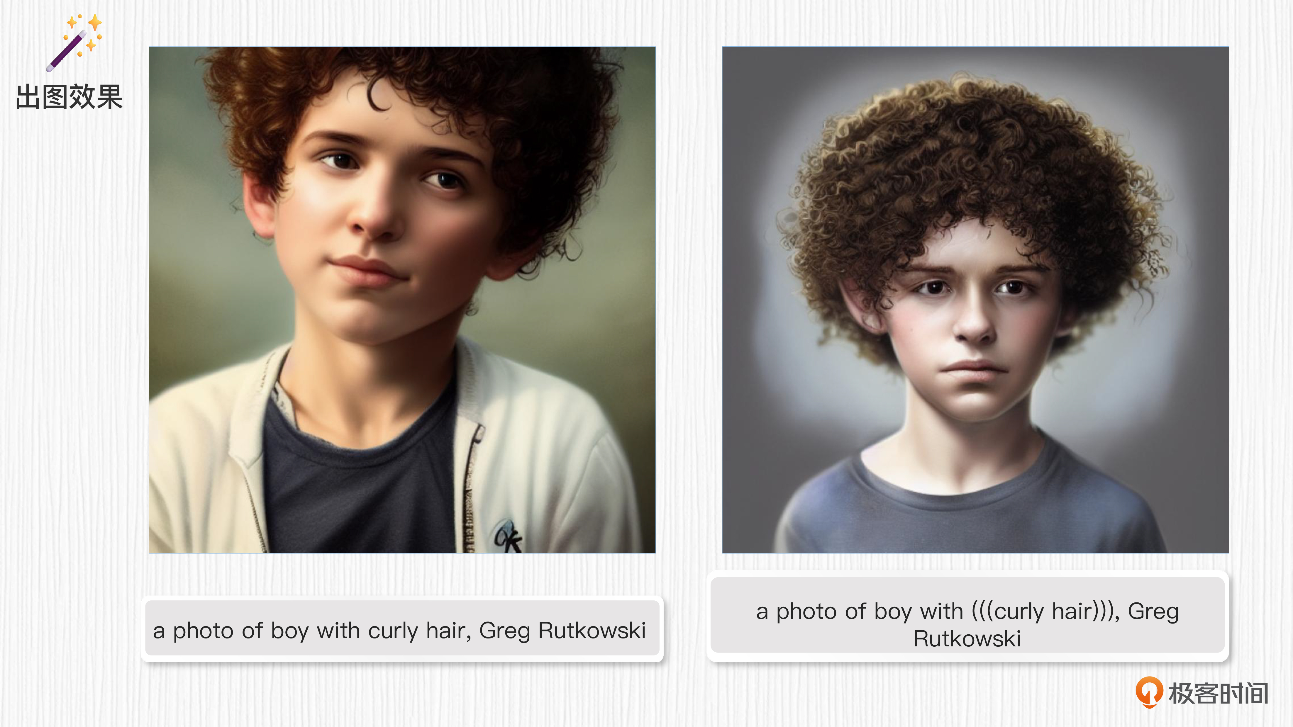 在WebUI中,有时我们希望强调prompt语句中的特定词汇。为了实现这一目的,我们可以使用圆括号 ( ) 来突出显示这些词汇。举个例子,如果我们想强调少年头发的卷曲特征,即curly hair,只需在该词汇外添加多个 ( ),以突出显示该词汇,从而引导生成模型更加关注这一特定要素。