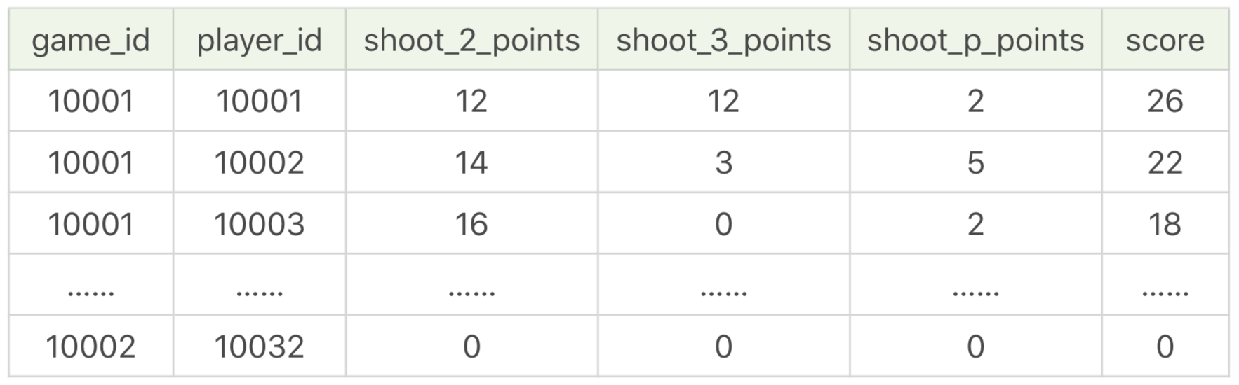 如果我想要统计每位球员在每场比赛中的二分球、三分球和罚球的得分,可以通过创建视图完成: