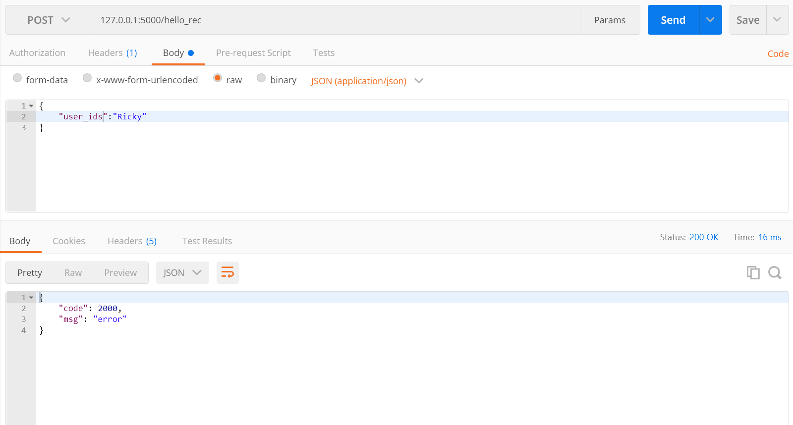 第11行到20行是我们实现这个功能的主体部分。在这里我们定义了一个路由,路由地址为“/hello_rec”,然后指定接收的请求为Post请求。在函数体部分,我使用了一个try函数,当请求的内容有问题时,为了让用户体验更友好,我直接使用jsonify返回一个编码为2000的错误,如果请求的内容是正确的,就去接收请求过来的user_id,然后返回hello加上user_id,最终使用jsonify包装后返回给用户。