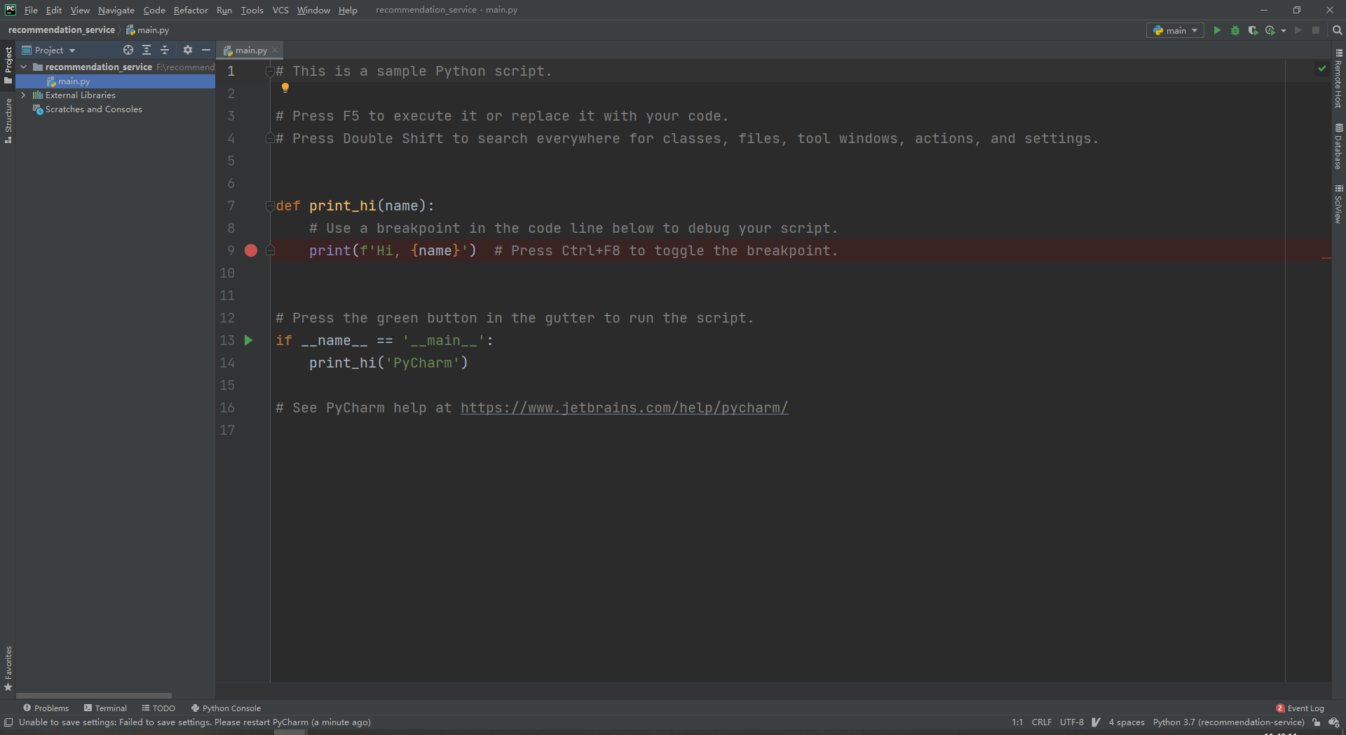首先,我们需要在Pycharm里建立一个Python的应用,如果你是professional版本的用户,也可以直接建立一个Flask应用。我们将项目命名为recommendation_service,在Python Interpreter里选择我们已经存在的Interpreter,如下图所示。