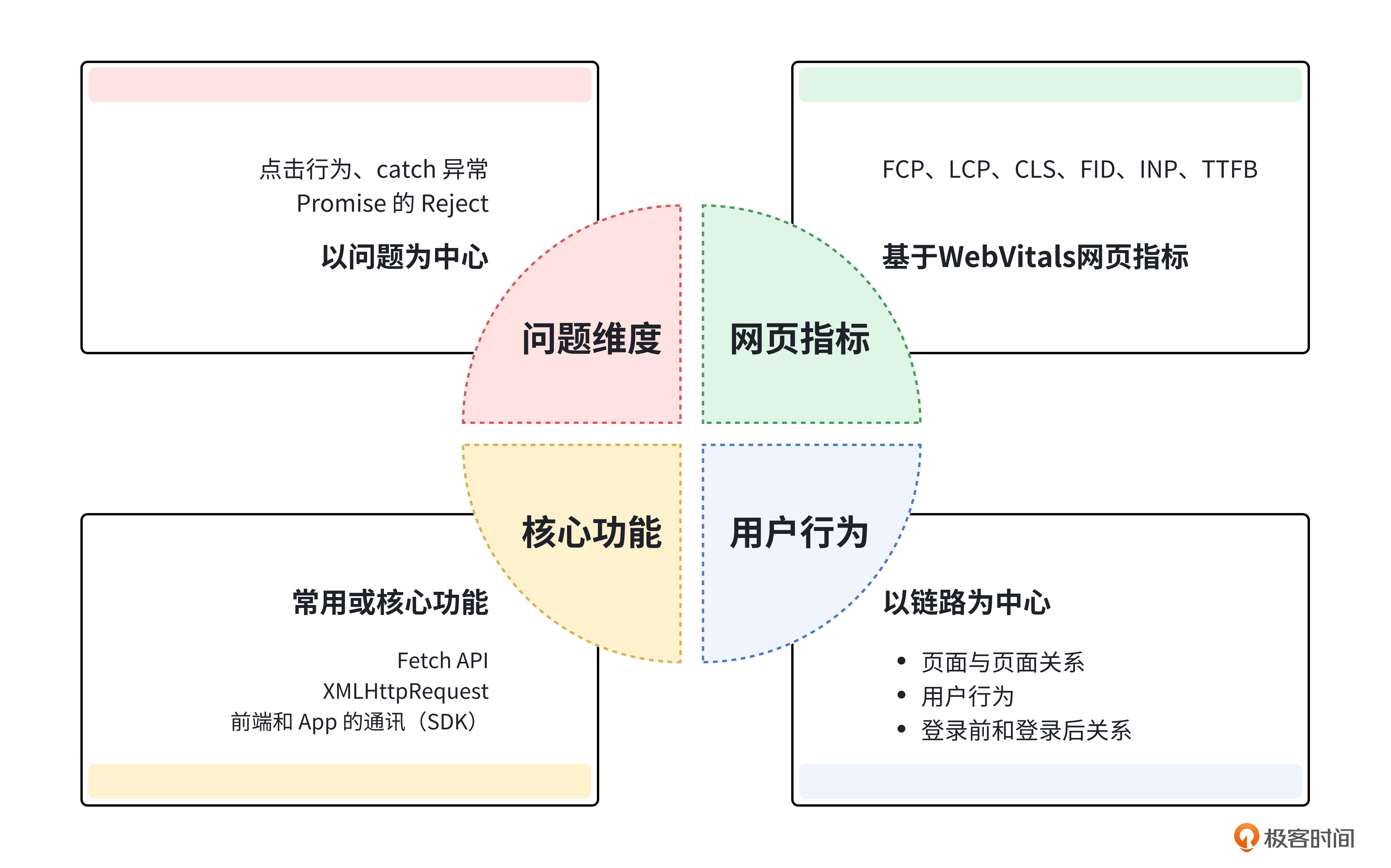 所以,真正的前端全链路监控,应该是以问题为中心的监控,包括下面这4个方面。