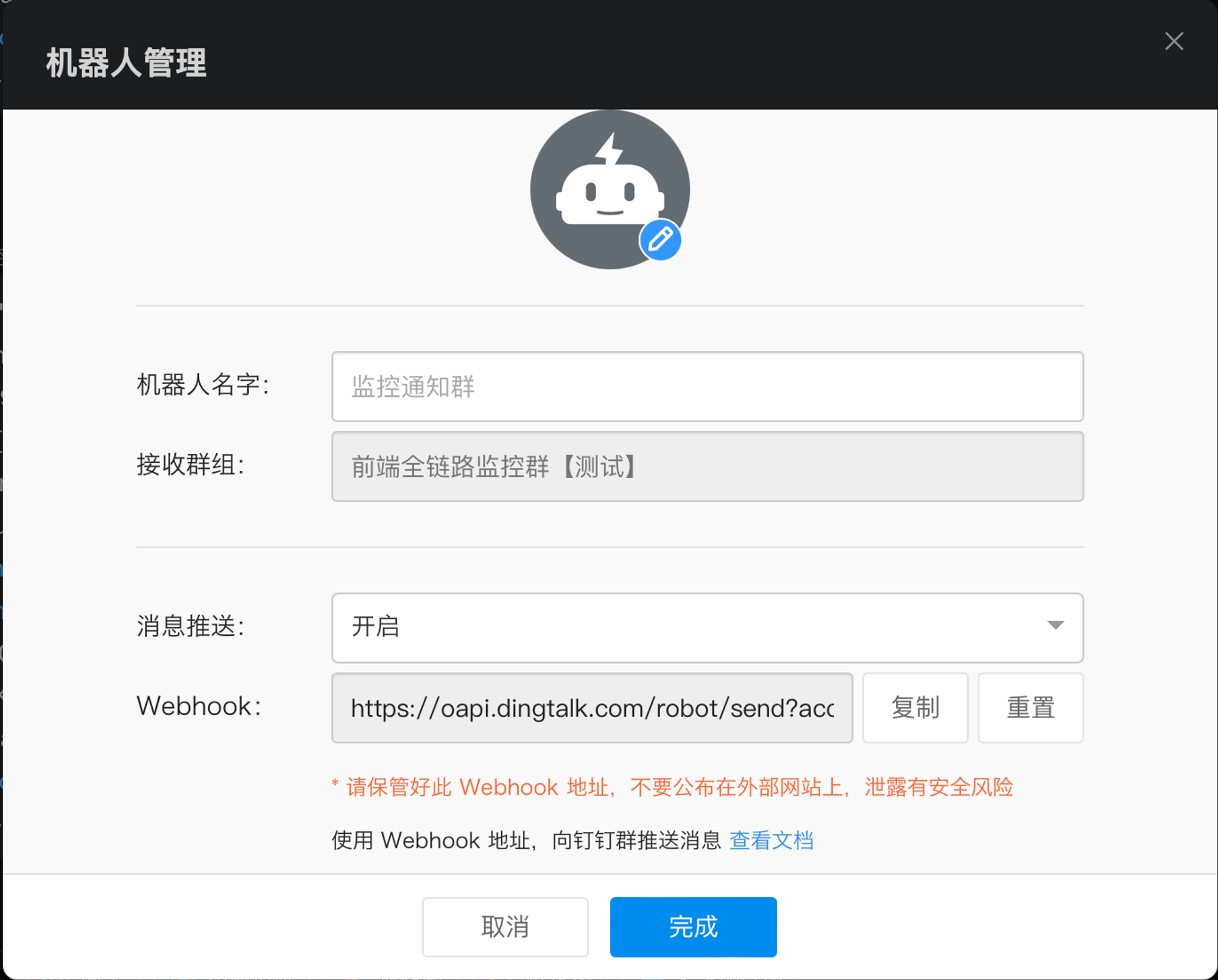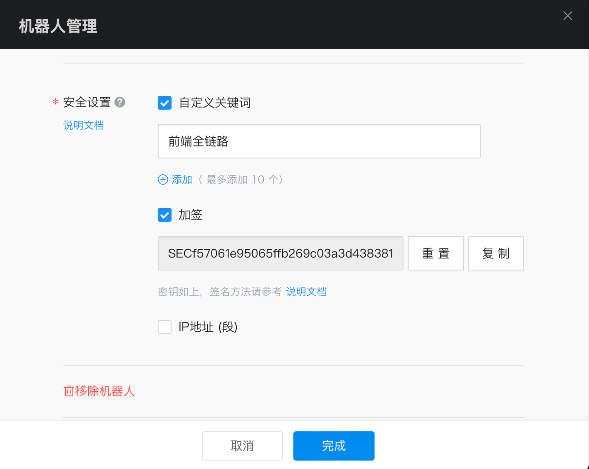 另外,为了确保webhook使用过程更安全,我们还需要开启签名加密和设定自定义关键词两个安全设置。其中,自定义关键词使用“前端全链路”5个字,这样,机器人就会判断必须包含“前端全链路”这个词才能发送成功。参考如下图。