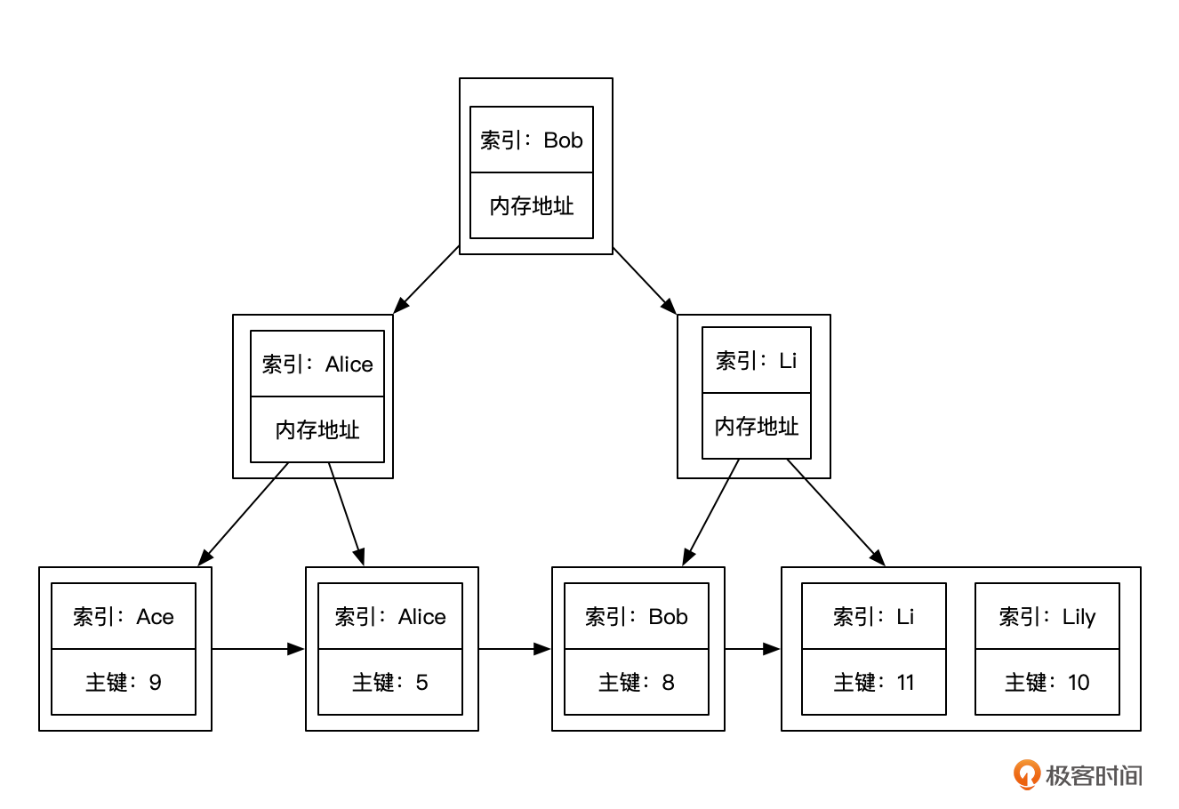 如果我要创建一个基于用户姓名的索引,MySQL会为我们构建一棵通过姓名找到主键的B+树。像下面这个图一样。