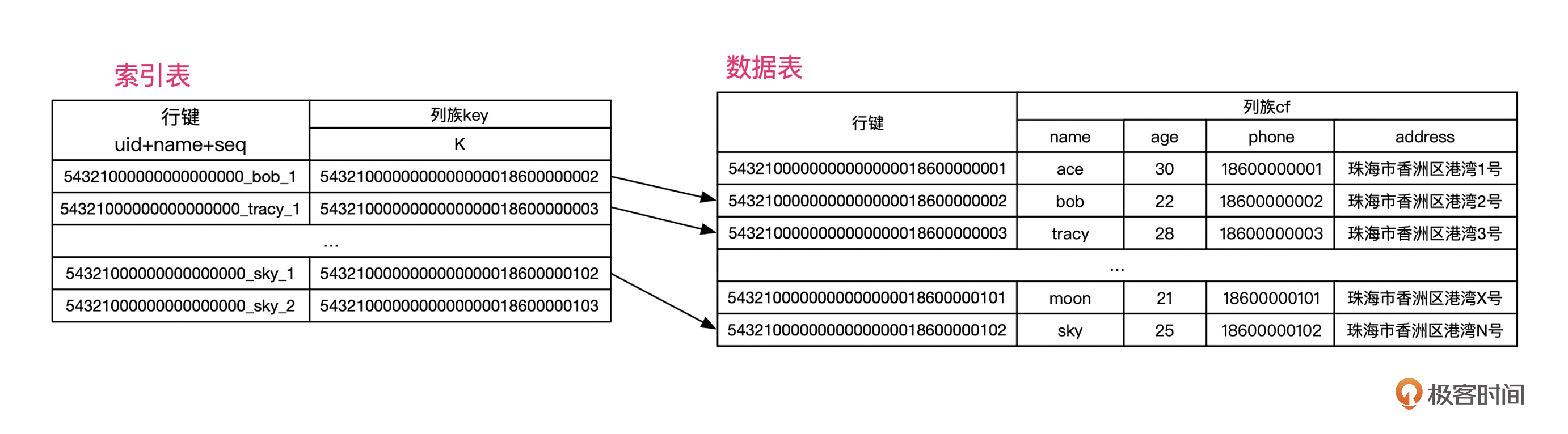 在前面的例子中,我们可以构建一个从姓名到用户联系人表行键的映射关系。这样就可以先通过姓名找到行键,再通过行键直接读取联系人数据。