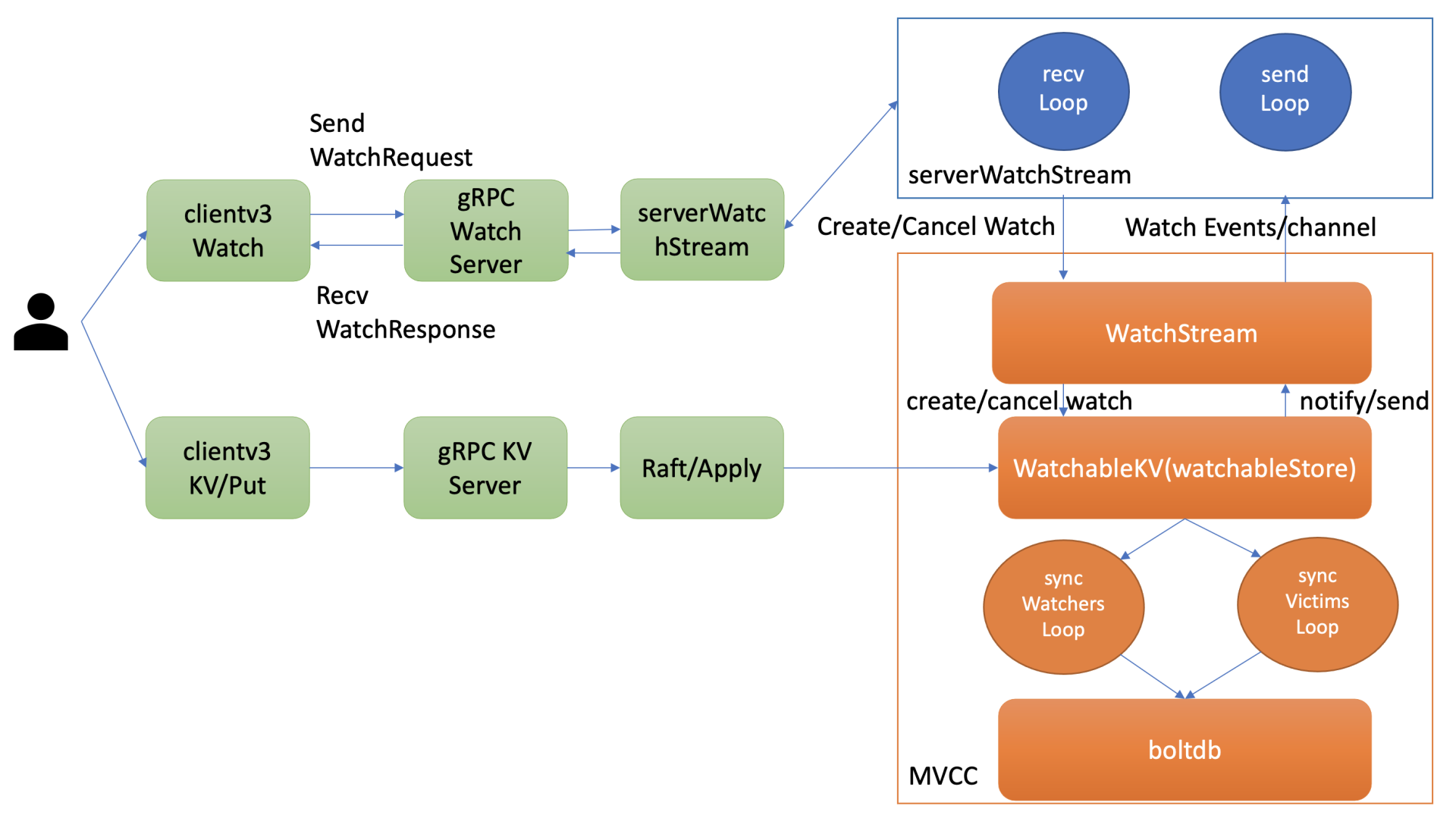 每个gRPC Watch Stream中etcd WatchServer会分配两个goroutine处理,一个是sendLoop,它负责Watch事件的推送。一个是recvLoop,负责接收client的创建、取消watcher请求消息。