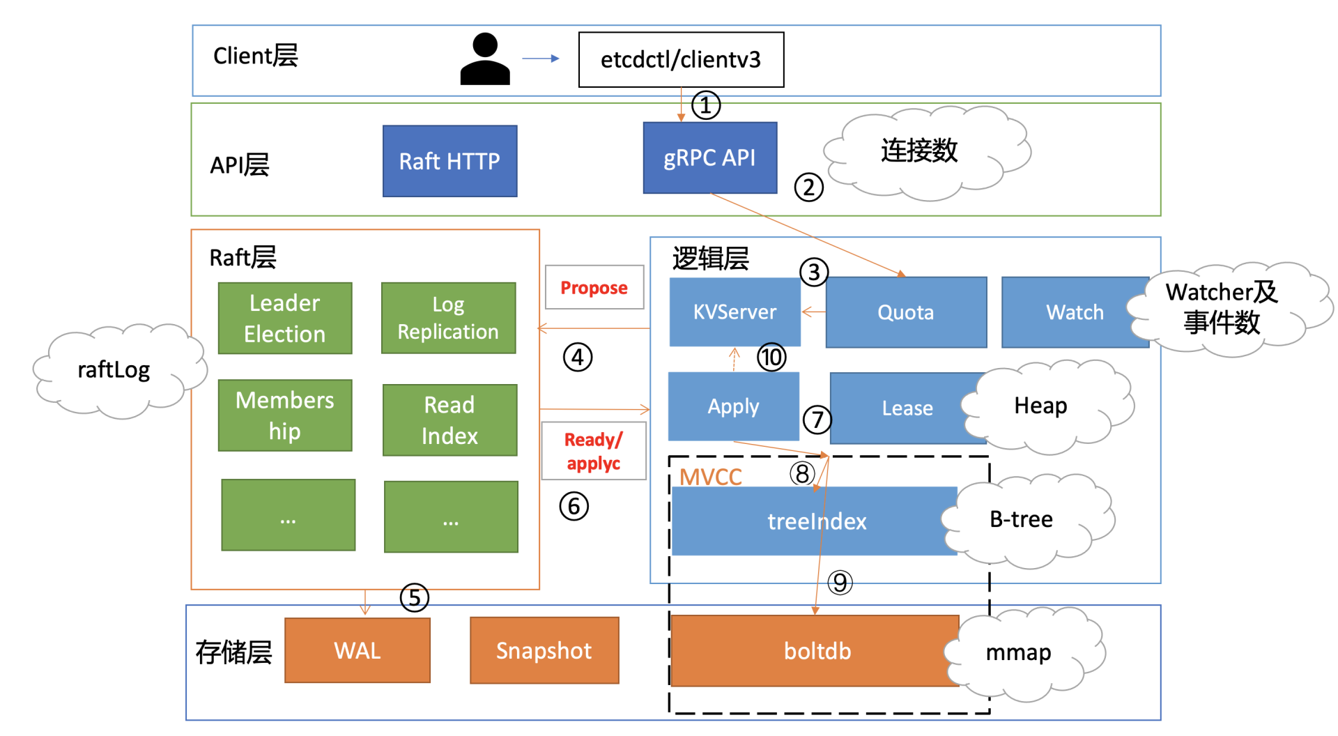 当你发起一个put请求的时候,etcd需通过Raft模块将此请求同步到其他节点,详细流程你可结合下图再次了解下。