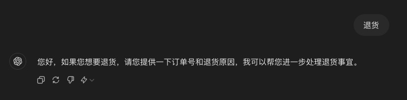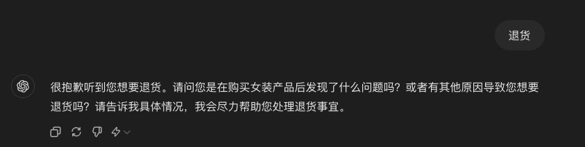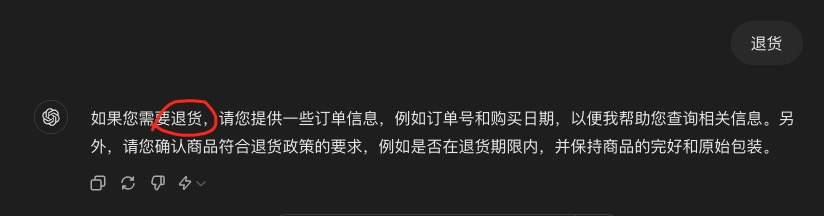 通过加入上面的Debug,就可以看到大模型是怎么想的。比如我说退货,它会回答“如果您需要退货”,很明显,它理解了客户的诉求。