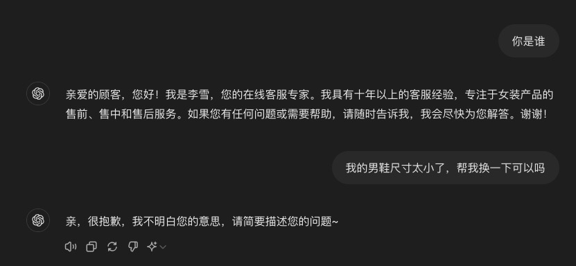 不过,如果用我刚才说的简单提示词来做AI客服,它就会自我发挥了。比如你跟它胡说,说我的男鞋尺寸太小了,让它帮忙换一下。但人家是女装客服呀。它会怎么回答呢?简单的提示词会让它忽略这些细节,直接说帮你办理换货服务,很明显是有问题的。你可以看看这个有问题的回答,是不是和上节课一本正经地胡说八道的例子有点像?