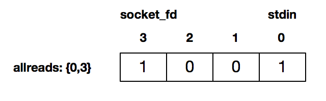 接下来程序的第13和14行,分别使用FD_SET将描述符0,即标准输入,以及连接套接字描述符3设置为待检测: