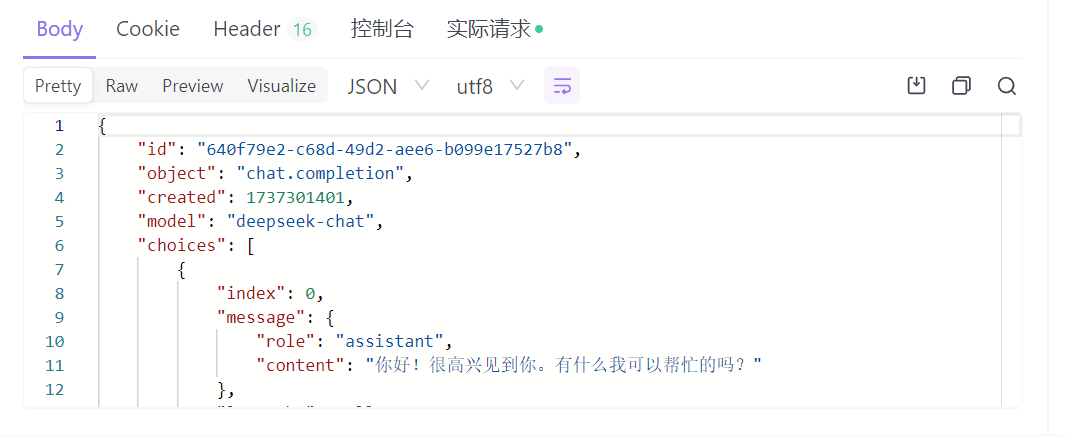 在收到回复后,查看 model,显示的是 deepseek-chat,说明代理生效了。