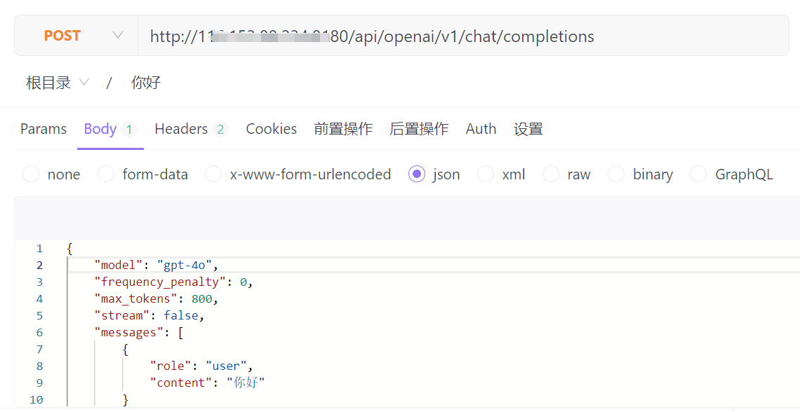 接下来,用 ApiFox 测试一下。请求时,大模型写的是 gpt-4o。