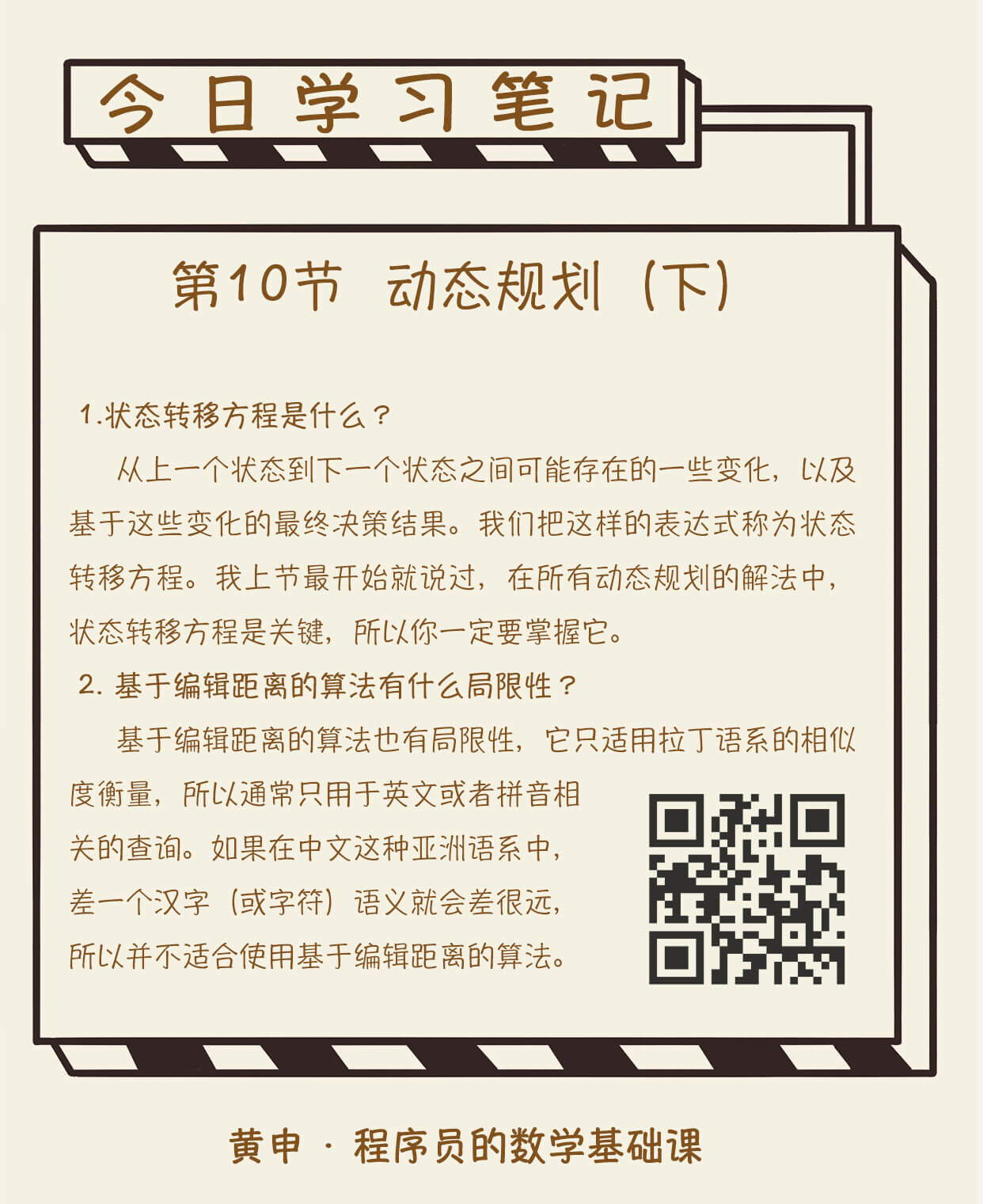 这里面最关键的一步是d[i, j]=min(d[i-1, j] + 1, d[i, j-1] + 1, d[i-1, j-1] + r(i, j))。这个表达式表示的是动态规划中从上一个状态到下一个状态之间可能存在的一些变化,以及基于这些变化的最终决策结果。我们把这样的表达式称为状态转移方程。我上节最开始就说过,在所有动态规划的解法中,状态转移方程是关键,所以你一定要掌握它。