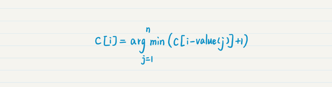其中,c[i]表示总额为i的时候,所需要的最少钱币数,其中j=1,2,3,…,n,表示n种面额的钱币,value[j]表示第j种钱币的面额。c[i - values(j)]表示选择第j种钱币的时候,上一步为止最少的钱币数。需要注意的是,i - value(j)需要大于等于0,而且c[0] = 0。