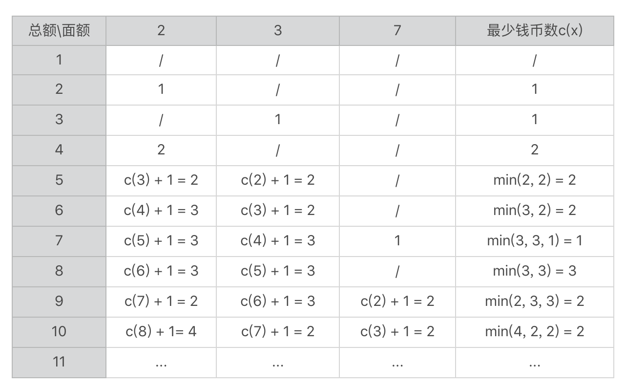 我这里使用这个状态转移方程,做些推导,具体的数据你可以看下面这个表格。表格每一行表示奖赏的总额,前3列表示3种钱币的面额,最后一列记录最少的钱币数量。表中的“/”表示不可能,或者说无解。