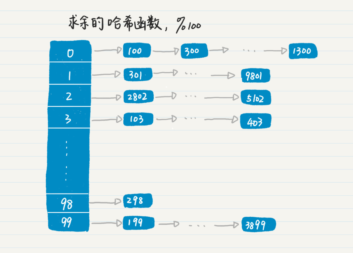在第2讲中,我还提到了使用求余相关的操作来实现哈希函数。我这里举个例子。你可以看我画的这幅图。