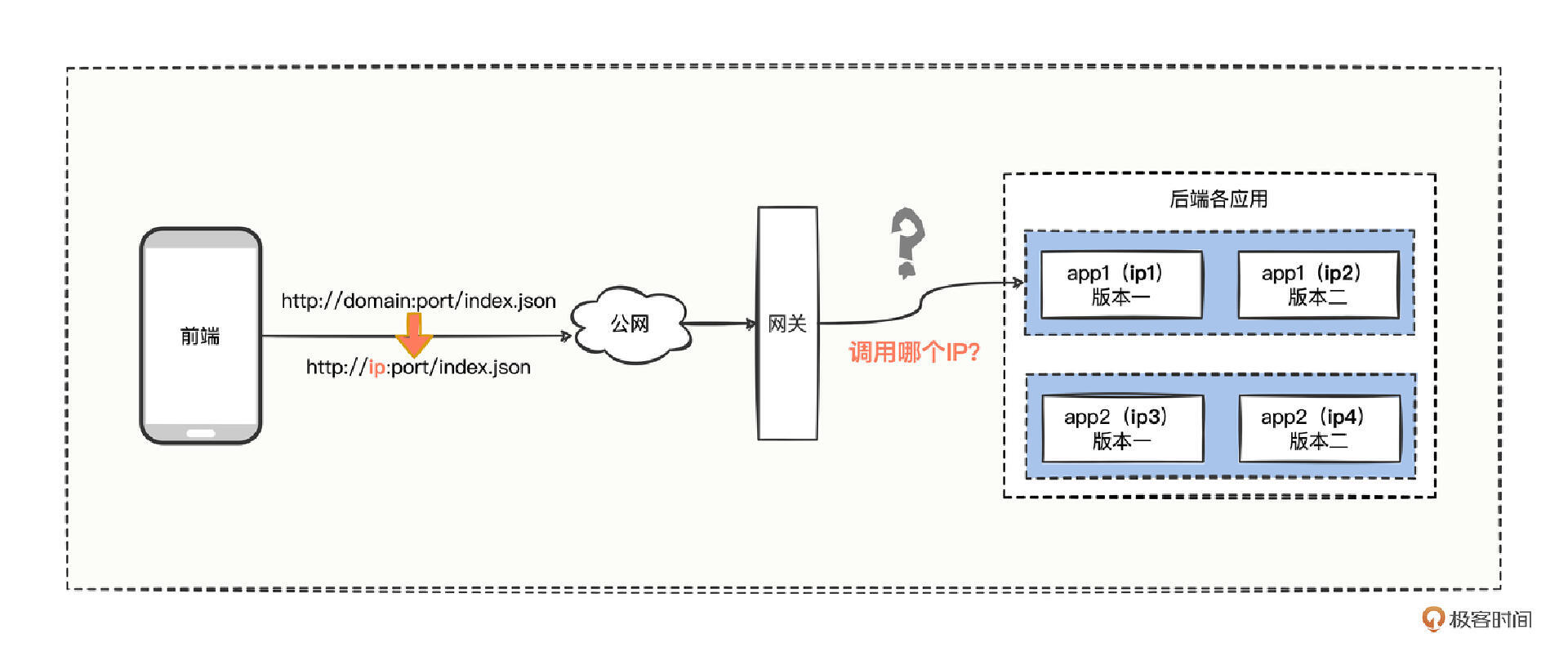 就像图中,有一个网关,两个后端应用 app1 和 app2,app1 的两个迭代版本分别部署在 ip1 和 ip2 节点上。现在,前端通过指定 IP 请求到了网关,网关继续调用 app1,该调用 app1 的 ip1 节点,还是 ip2 节点呢?网关是负载均衡调用,还是指定 app1 的 IP 调用呢?