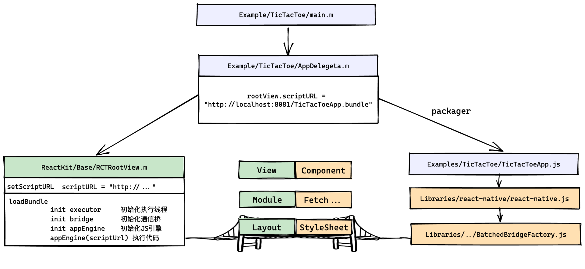大体上讲,React Native 上层抽象出来的 Libraries/Components 组件,底层对应的是 ReactKit/Views 组件;上层抽象出来的 Libraries/Fetch、Libraries/XHR 网络接口,其底层实现的是 ReactKit/Modules/RCTDataManager.m 文件;上层实现的样式 Libraries/StyleSheet,其底层是 ReactKit/Layout。