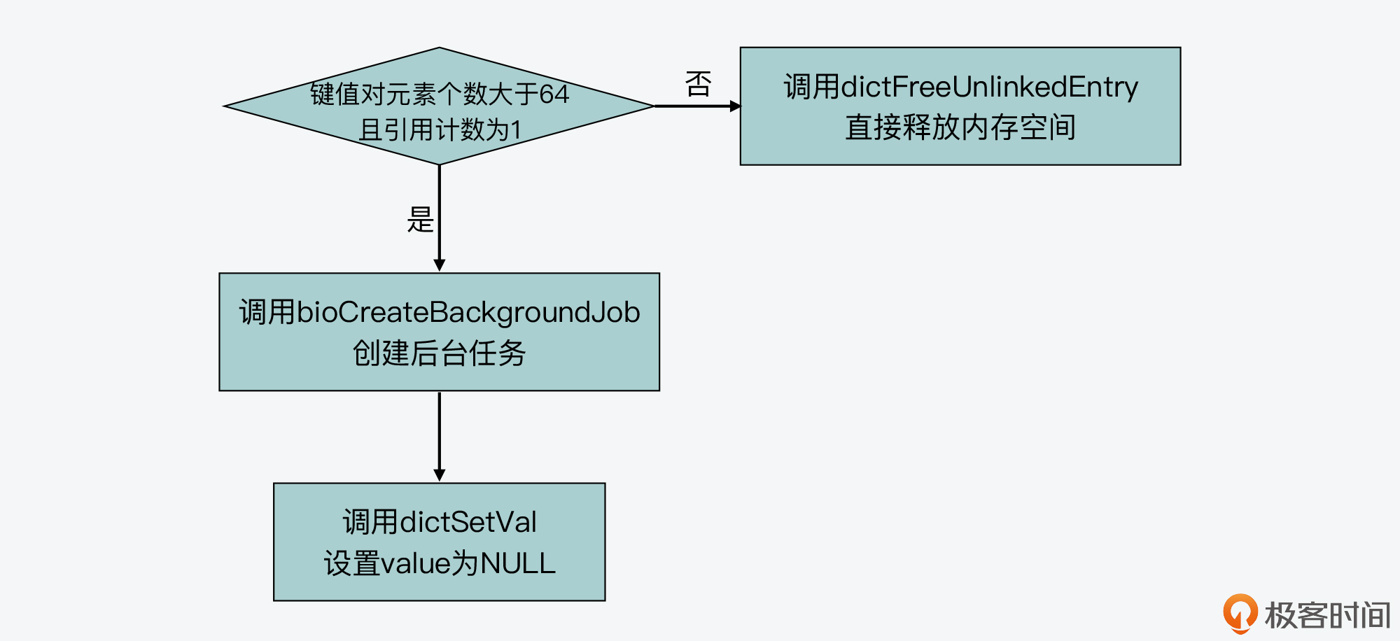 所以,当被淘汰键值对是包含超过64个元素的集合类型时,dbAsyncDelete函数才会调用bioCreateBackgroundJob函数,来实际创建后台任务执行惰性删除。关于bioCreateBackgroundJob函数的作用和工作机制,我在[第12讲]中已经给你介绍过了,你可以再去回顾下。