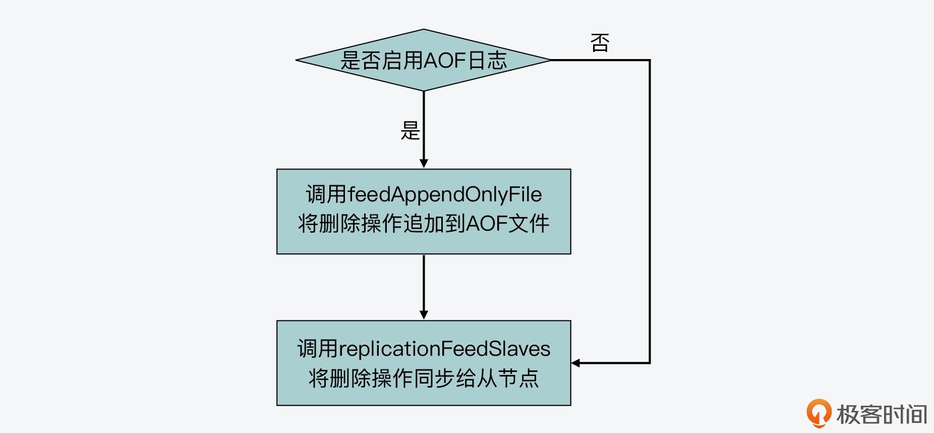 紧接着,propagateExpire函数会判断Redis server是否启用了AOF日志。如果启用了,那么propagateExpire函数会先把被淘汰key的删除操作记录到AOF文件中,以保证后续使用AOF文件进行Redis数据库恢复时,可以和恢复前保持一致。这一步是通过调用feedAppendOnlyFile函数(在aof.c文件中)来实现的。