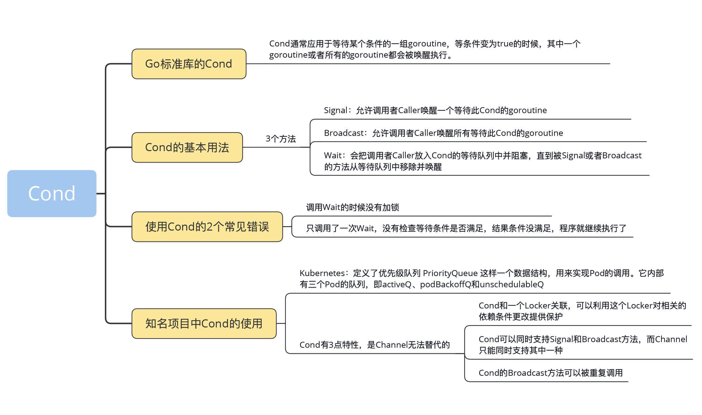 在实践中,处理等待/通知的场景时,我们常常会使用Channel替换Cond,因为Channel类型使用起来更简洁,而且不容易出错。但是对于需要重复调用Broadcast的场景,比如上面Kubernetes的例子,每次往队列中成功增加了元素后就需要调用Broadcast通知所有的等待者,使用Cond就再合适不过了。