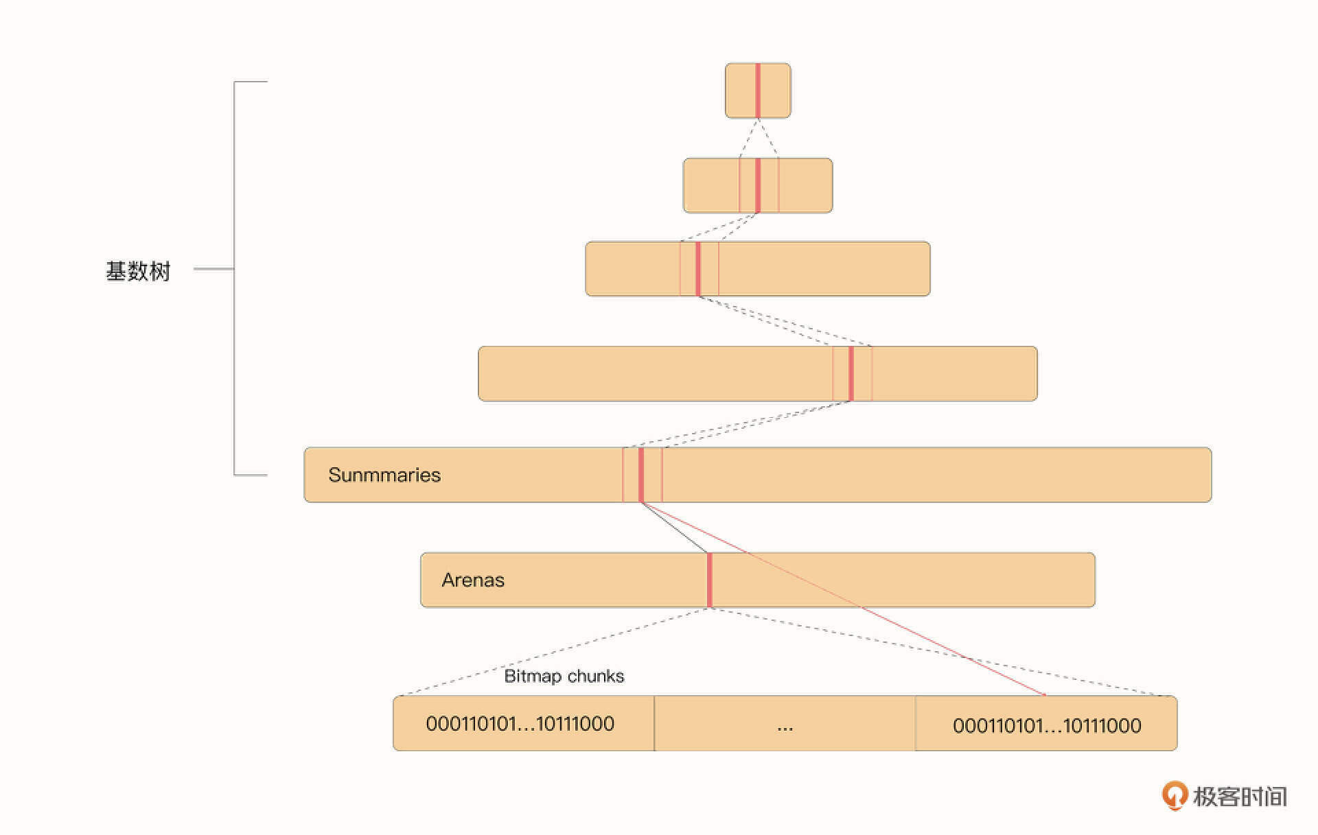 - Go 1.14之后,如果要分配的 page 过大或者在逻辑处理器 P 的Cache 中没有找到可用的page,就需要对mheap 加锁,并在 mheap 管理的整个虚拟地址空间的位图中查找是否有可用的page。这涉及 Go 语言对虚拟地址空间的位图管理,这种管理方式也被称为基数树。