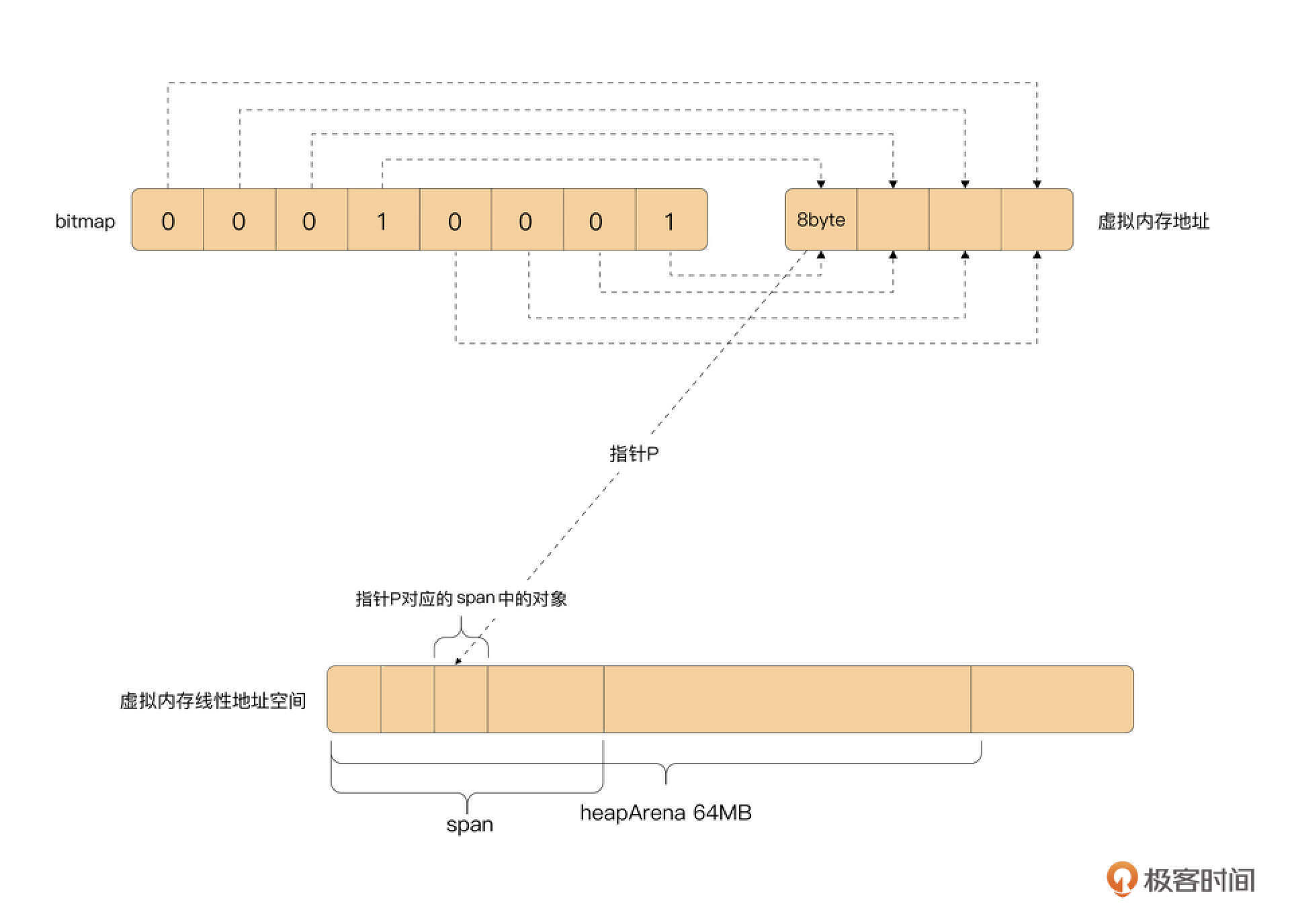 - 如果在基数树中查找不到可用的连续内存,就需要从操作系统中获取内存了。在Unix 操作系统中,最终使用了mmap 系统调用向操作系统申请内存,每一次向操作系统申请的内存大小必须为heapArena 的倍数。在64 位Unix 操作系统中,heapArena 的大小为64MB。这意味着即便需要的内存很小,最终也至少要向操作系统申请64MB 内存。多申请的内存可以用于下次分配。Go 语言中对 heapArena 有精准的管理,每个指针的内存信息,每个page 对应的 span 信息都有记录。