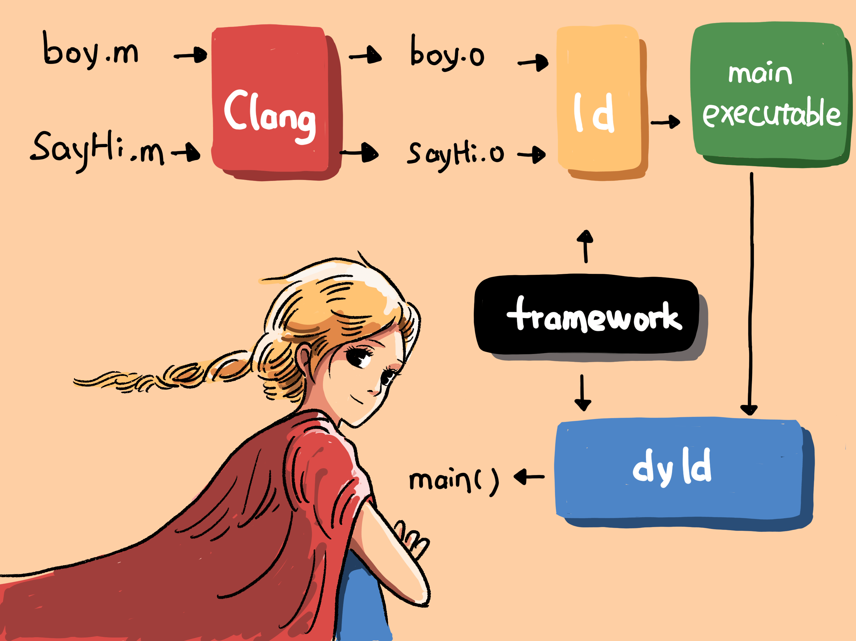 而关于动态链接器的作用顺序是怎样的,你可以先看看 Mike Ash 写的这篇关于 dyld 的博客: Dynamic Linking On OS X。这篇博客里面,很详细地讲解了 dyld 所做的事情。